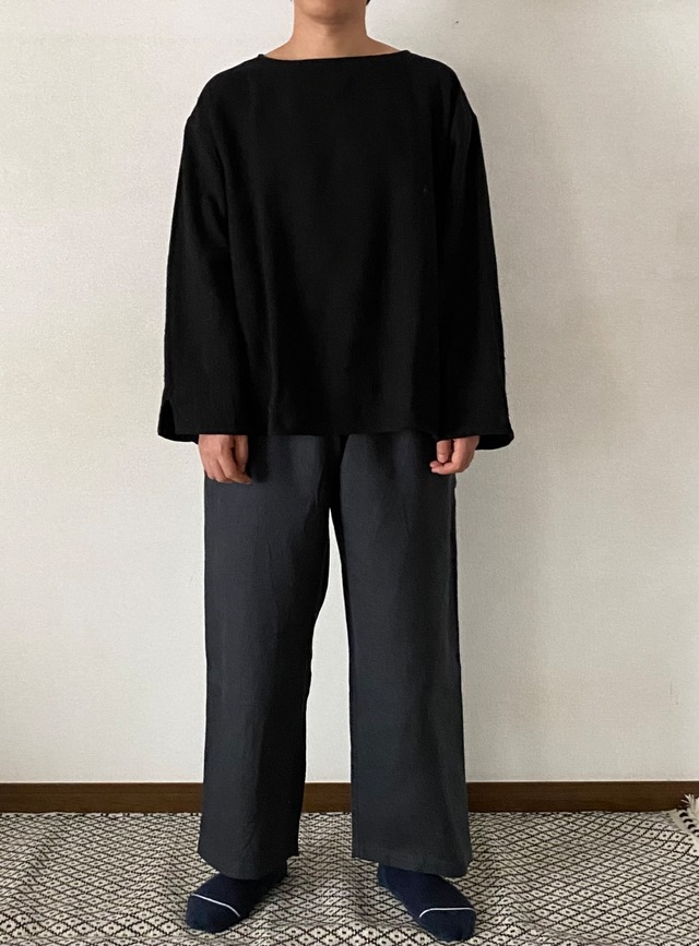 MITTAN 大麻ワイドパンツ 厚 大麻100% 通常使用している大麻生地よりも太い番手の為、しっかりとした厚手の生地になります。 前ファスナー有りのユニセックスのパンツです。 大麻は強靭な繊維ですが、経年変化で肌に徐々に馴染んでゆき、麻から綿のような質感の変化が楽しめます。 大麻の特性であるひんやりとした触感は洗濯を繰り返しても継続し、真夏でも快適に着用が可能です。 シルエットはPT-26をベースにした、ストレートのデザインです。 ベルトループが付いていますが、ウエストゴムと内側の紐で、ベルトを用いなくても着用が可能になっています。 インナーを調整する事で多くの季節で着用が可能です。 男性身長173cm サイズ2(墨黒)着用 サイズ3(黒)着用 ✳︎天然素材独特の糸の節やムラ感があります。風合いを重視し、繊維長が不均一な原料を使用している為ですので、表情の一部としてお考えください。 生地の糸が切れ、穴が開く可能性がある為、糸の節は無理に引っ張らないようご注意ください。 ✳︎濃色で染色をしています。色移りを避ける為、淡色との組み合わせはお控えください。 色の退色を防ぐ場合はドライマーク用の洗剤を使用し、日陰で干してください。製品後の加工の為、1点1点、色の出方やサイズが微妙に異なります。 ⭐︎MITTANの製品につきまして、何度も同じ商品を購入される方、大量に購入される方には、一切のご購入をお断りする場合がございます。 ブランドのポリシーにより、代理購入の禁止、倉庫への発送が禁止されております。 また、1品番につき2点までのご購入となっております。 RFIDタグが内蔵されており、購入経路の確認が出来るシステムとなっております。 ◯カラー サイズ1 墨黒 サイズ2 墨黒sold → 白は在庫があります◯ サイズ3 黒 ◯素材 : (植物繊維)大麻100% ◯サイズ 1: ウエスト60-73cm ヒップ104cm 着丈92cm 股下60cm レディースM相当 2: ウエスト68-82cm ヒップ122cm 着丈97.5cm 股下65cm メンズM相当・レディースML相当 3:ウエスト70-83cm ヒップ126cm 着丈102cm 股下66cm メンズL相当です。 ◯品番 PT-112 MITTANでは随時ケアのご相談も承っております。 商品詳細についてはこちらの商品解説サイトをご覧ください。 https://mittan.asia/PT-103/ MITTANのプロダクツは1シーズンではなく、長く、生地が擦り切れそうになっても尚着続ける事を前提にデザインされています。 長くご愛用していただく為にMITTANでは随時ケアのご相談と修繕を承っています。 お直しの詳細はこちらをご覧ください。 http://mittan.asia/repair/ *実際の商品の色や質感はご利用の環境によって微妙に異なって見えることがございます。 ご了承ください。 <MITTAN> MITTANは世界に遺る衣服や生地にまつわる歴史を元に、現代の民族服を提案しています。 平面的な構造を再解釈し、天然素材が持つ本来の機能性と組み合わせることで、一過性の時代の流れにとらわれることの無い、永く続く服を目指しています。 ・生産背景 MITTANは世界に遺る衣服や生地にまつわる歴史生地は遠州、播州、尾州といった日本各地の機械織りの産地をはじめ、インド、ラオスといったアジア圏の手織りのものを主に使用。 デザイナーが可能な限り直接機場に赴き、独自の素材開発にも取り組んでいます。 また縫製糸には主に綿糸を、織りネーム、品質表示、ボタン等の付属品には天然素材を用い、国内の提携工場で縫製しています。 染色には通常の染料の他、草木や藍、虫、鉱物を使用し、その不均一な色の移り変わりも美しさとして捉えています。 ・社会的責任 2013年のブランド設立当初から続けている修繕・染め直し、及び継続的な定番品の展開は大量廃棄を前提とした生産構造に対する弊社なりの反抗で、ブランドを設立した大きな意義となっています。 また多方面より背景を伝え続けることで、精神的にも物理的にも遠くへ行ってしまった服をより身近な存在に取り戻し、継続的な着用に繋げていきます。 (MITTANのwebサイトより転載)http://mittan.asia/about/