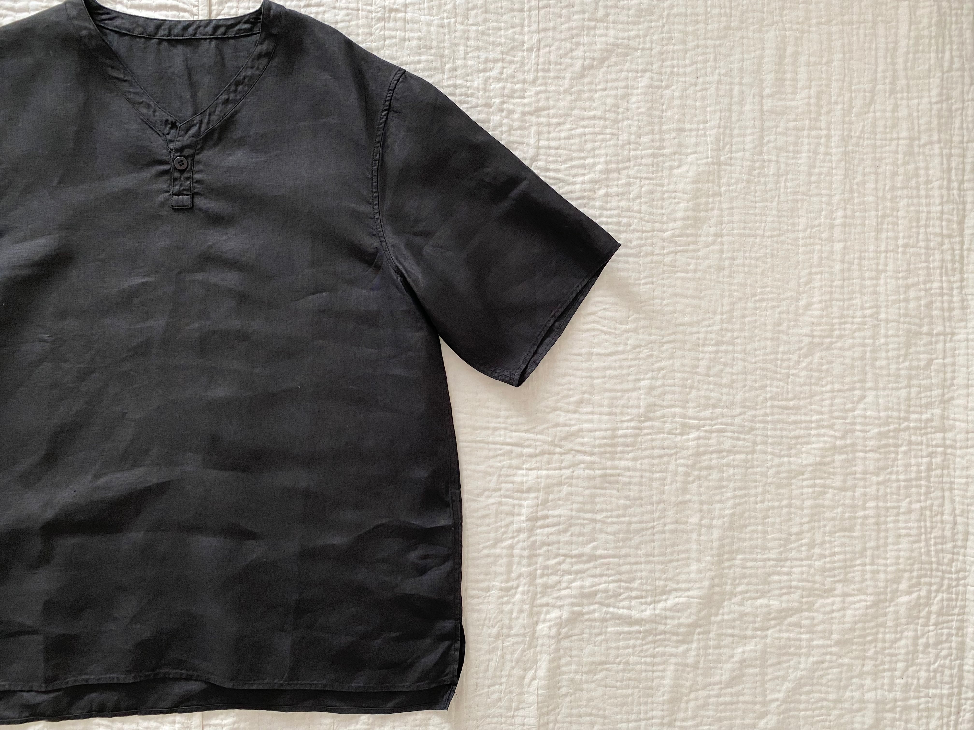 V字にしたヘンリーネックに、あえて1つボタンにする事でシンプルなデザインが特徴です。