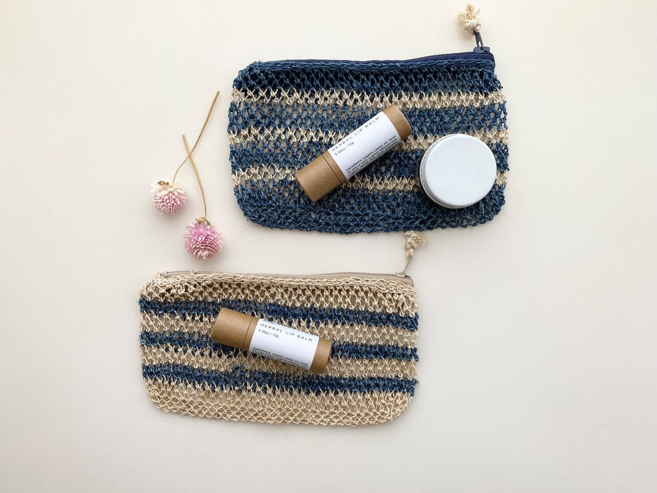 葛編みポーチ ボーダーS 薄藍・生成