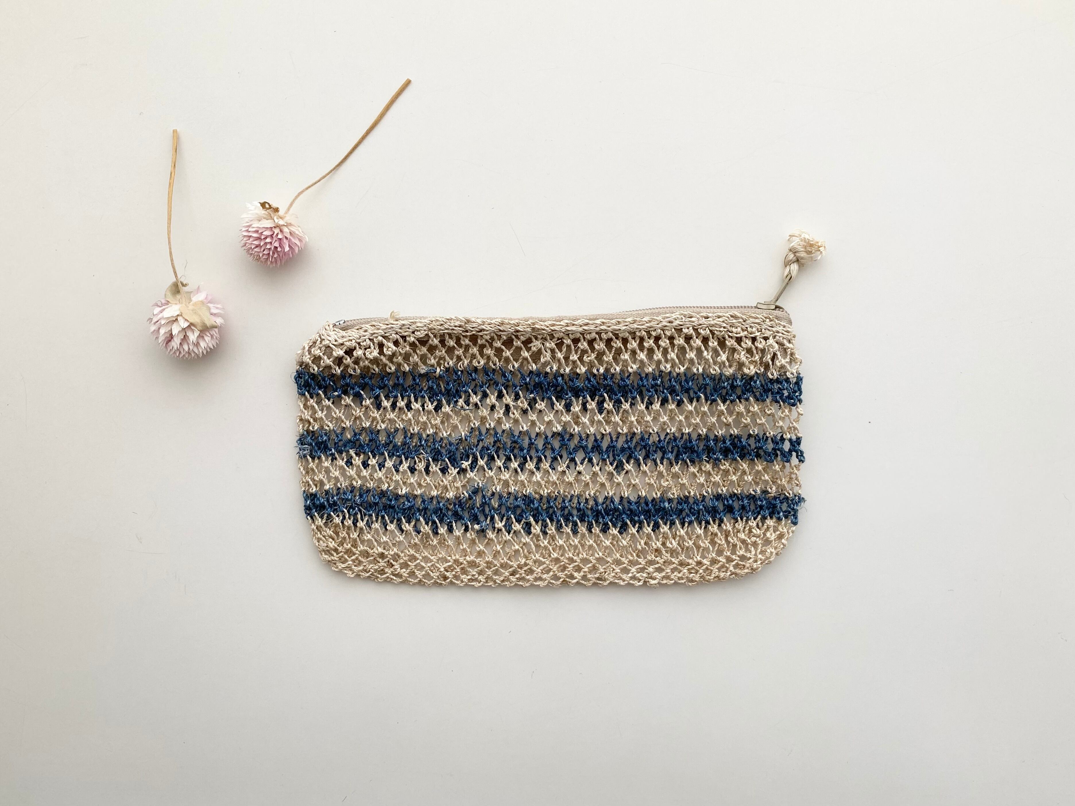 葛の茎の部分から取り出した繊維をつなげた糸をつかって、ラオス北部の村でひとつひとつ手編みで作られているポーチ。