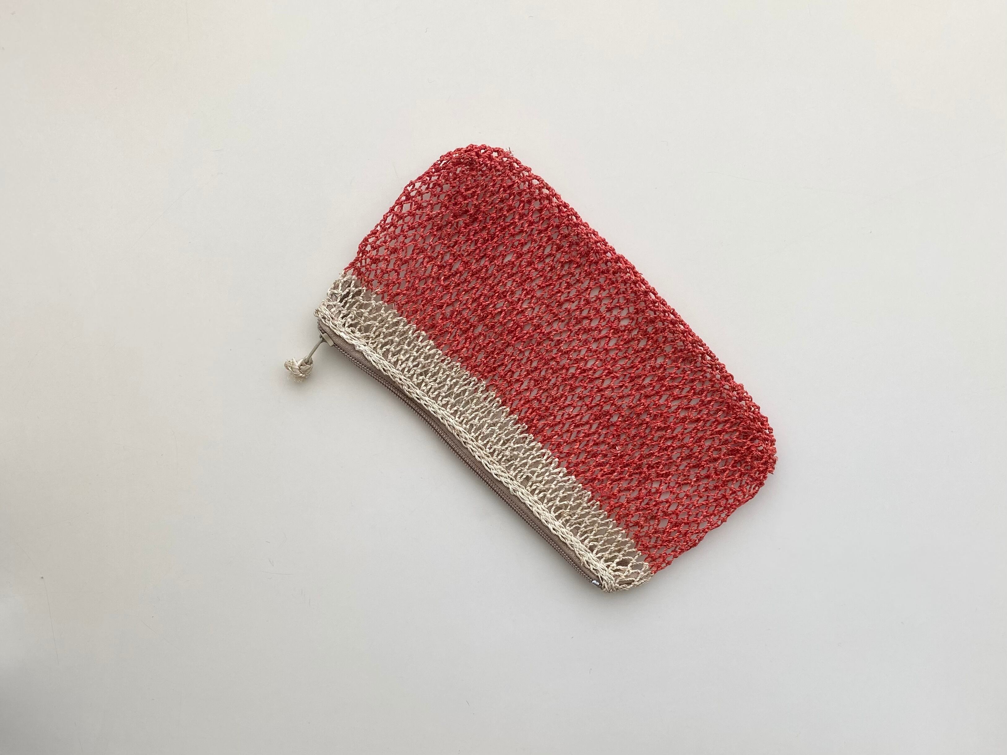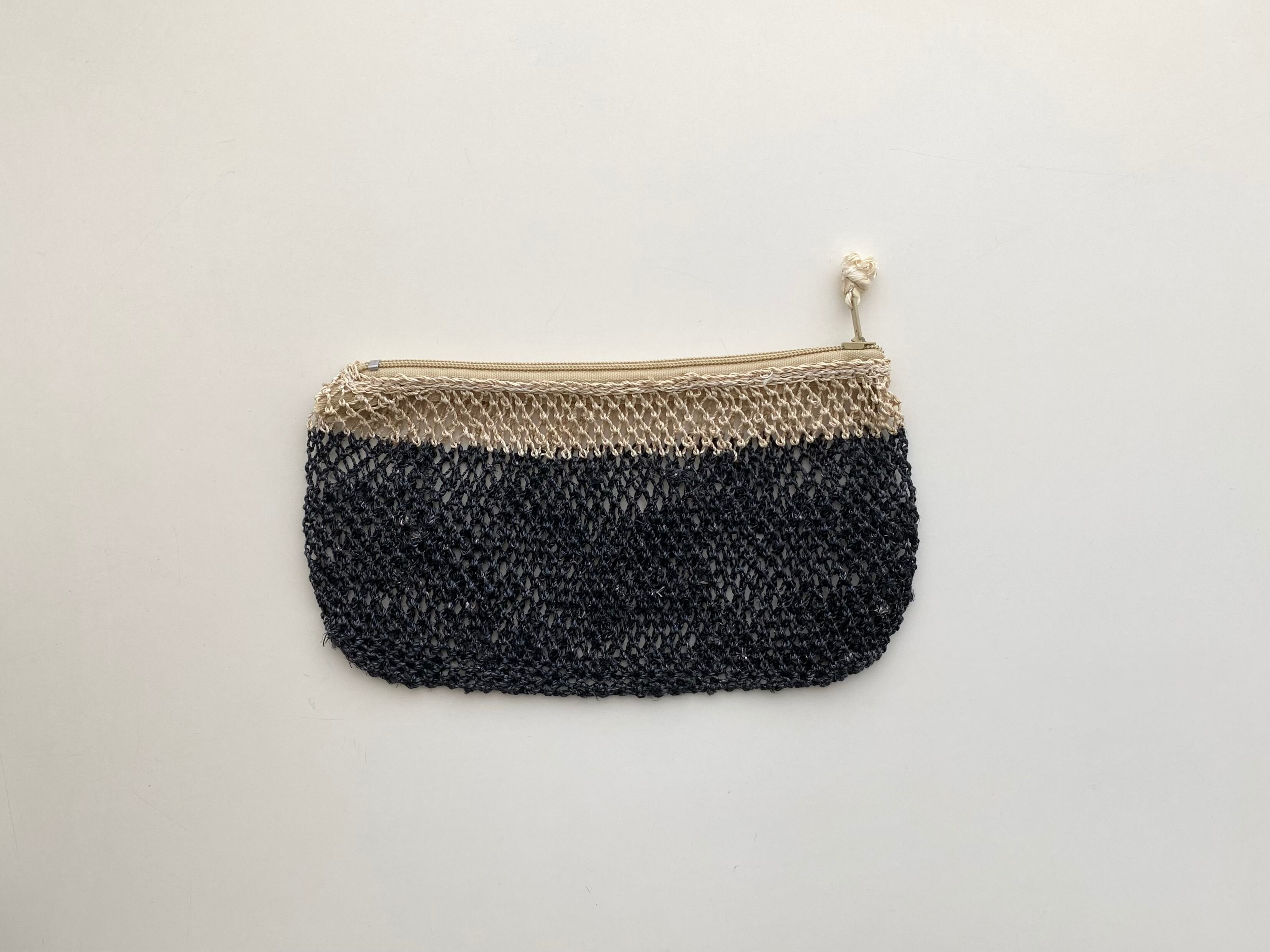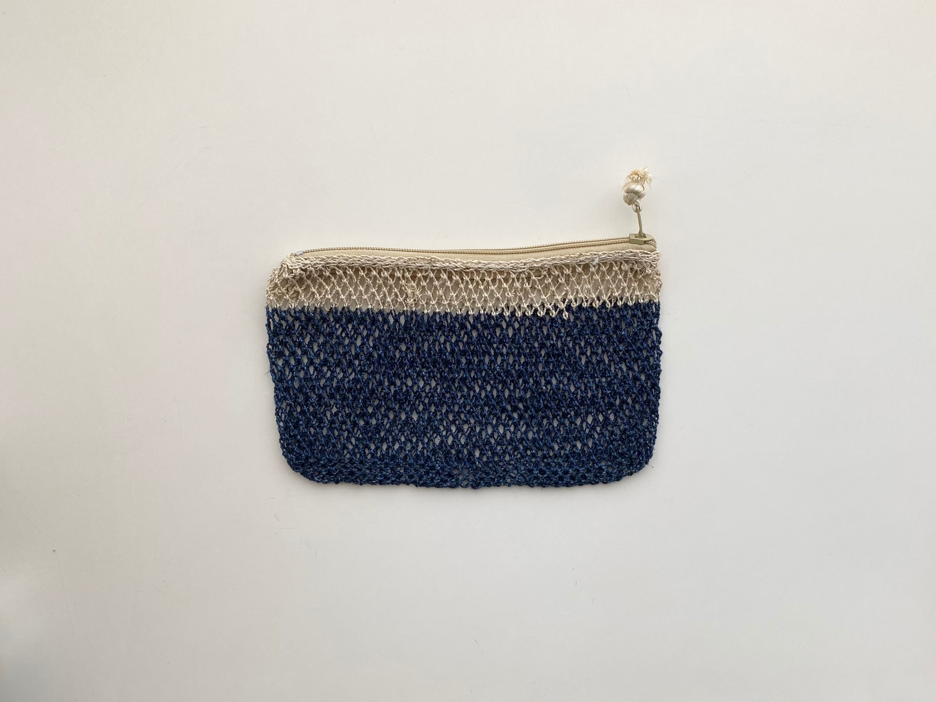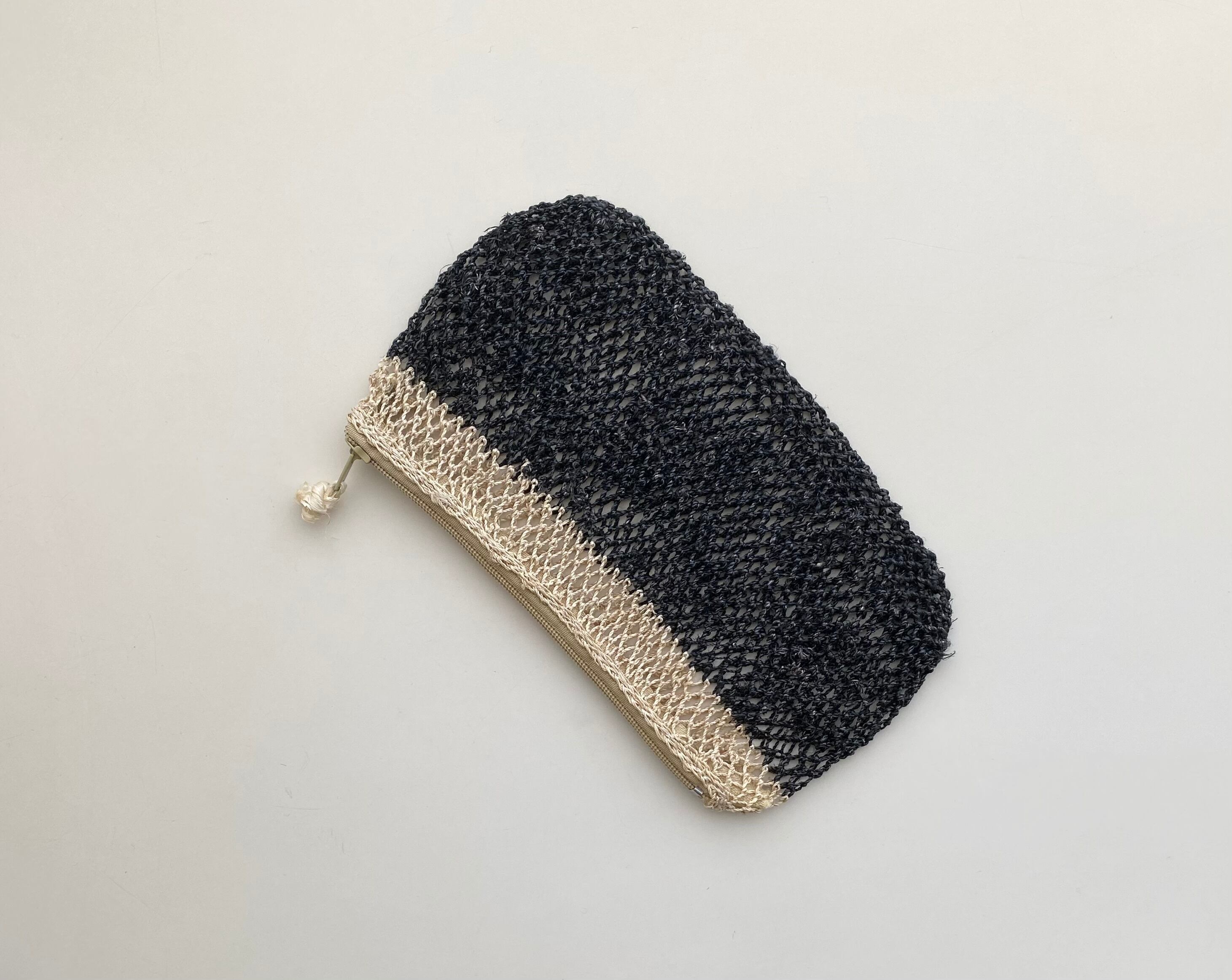 葛の茎の部分から取り出した繊維をつなげた糸をつかって、ラオス北部の村でひとつひとつ手編みで作られているポーチ。