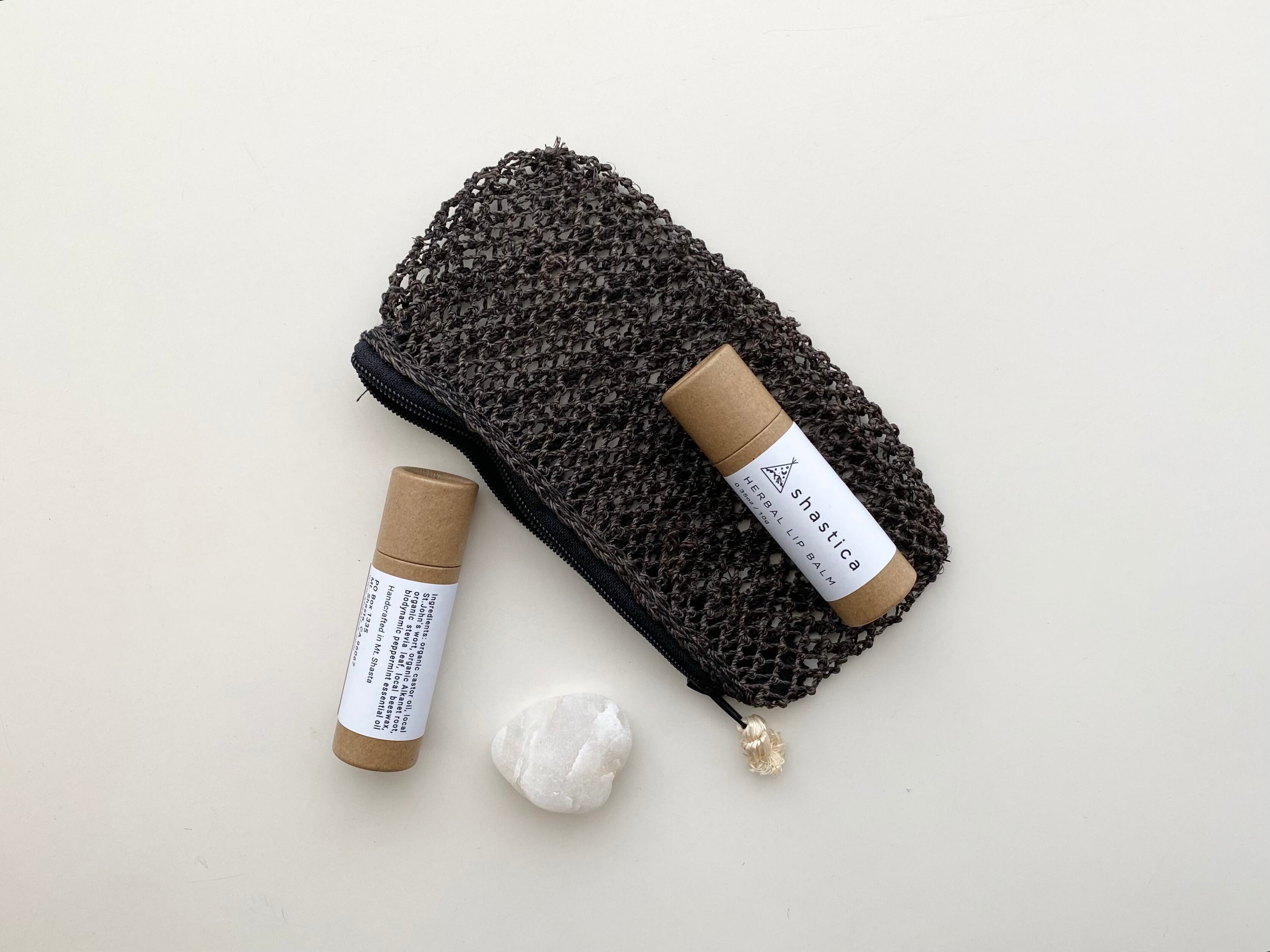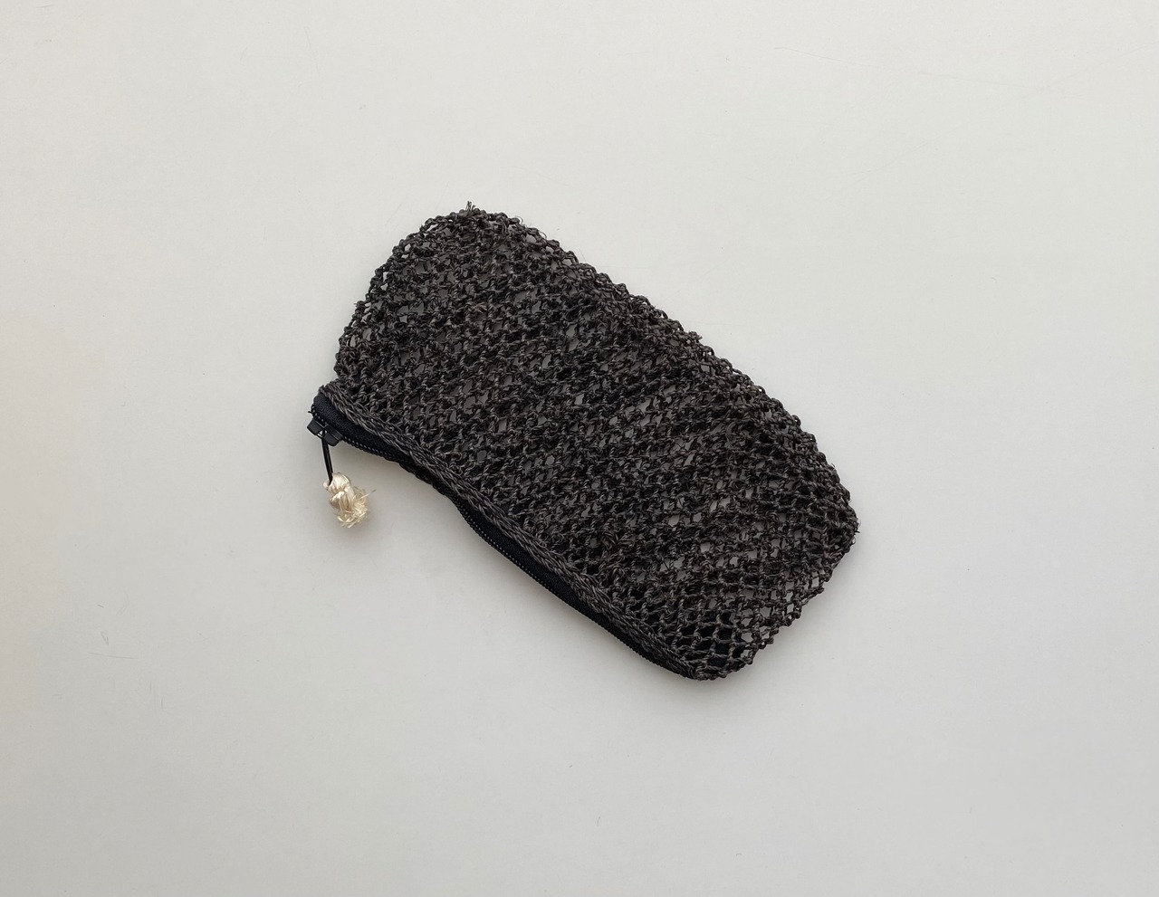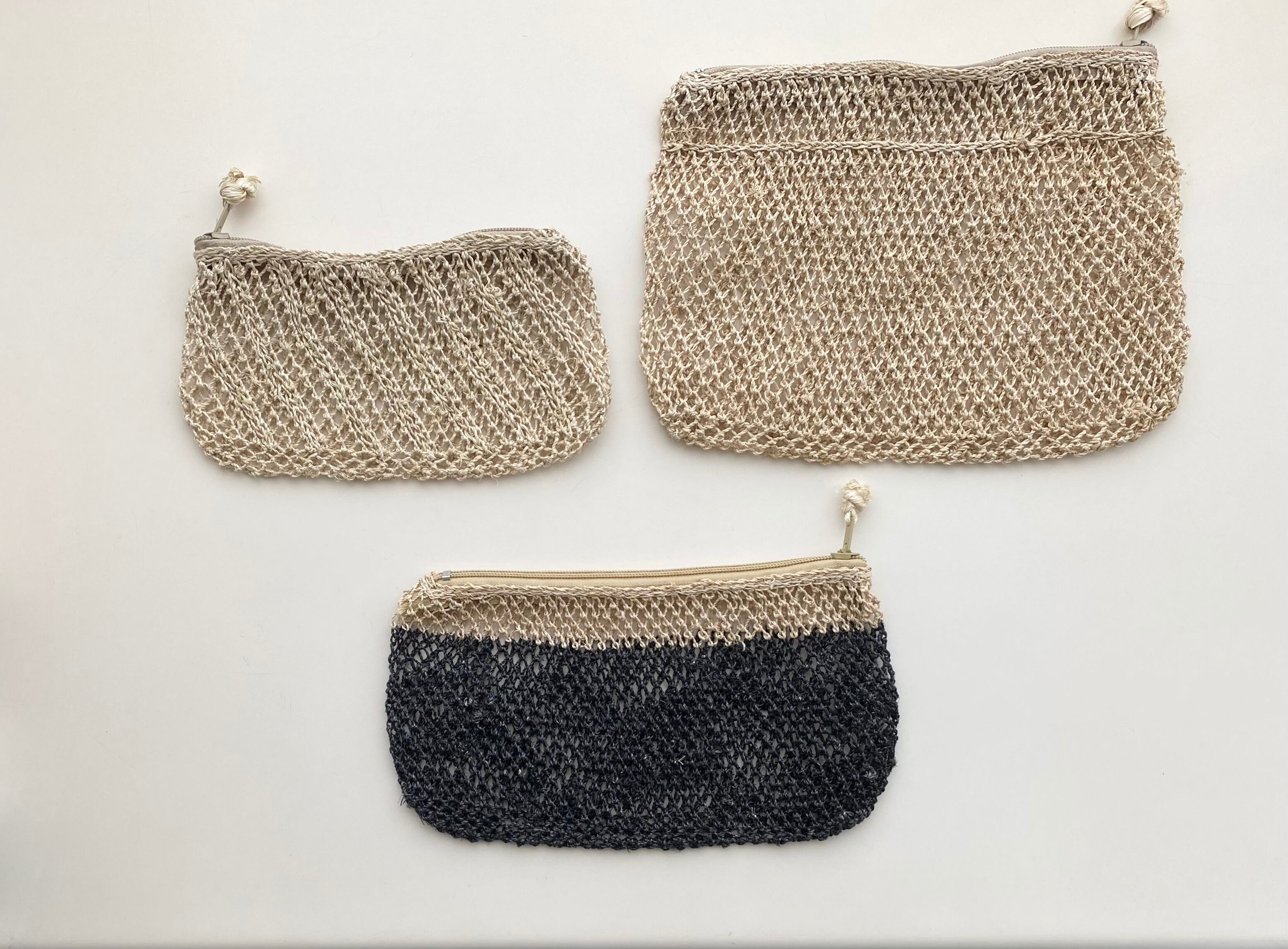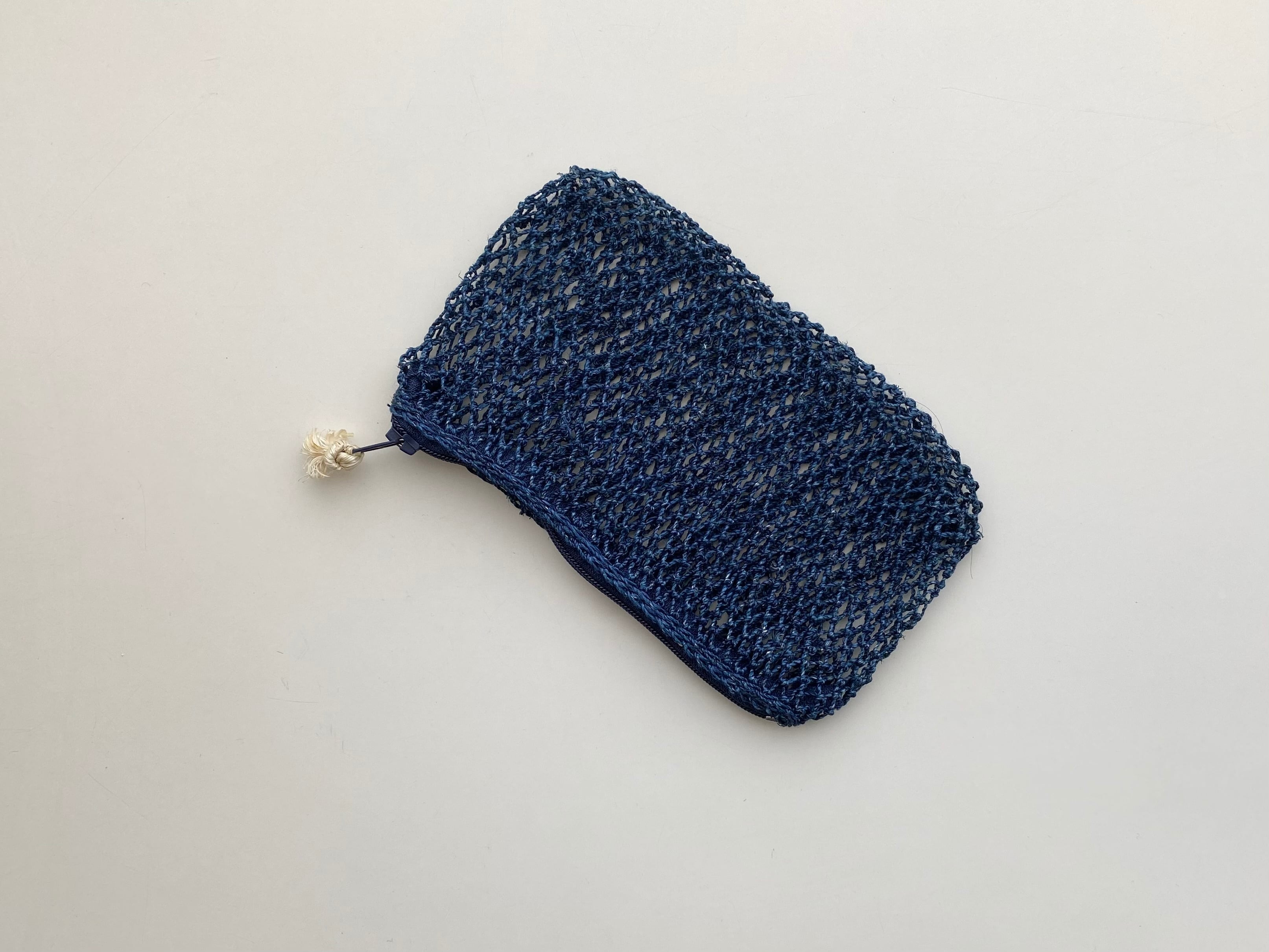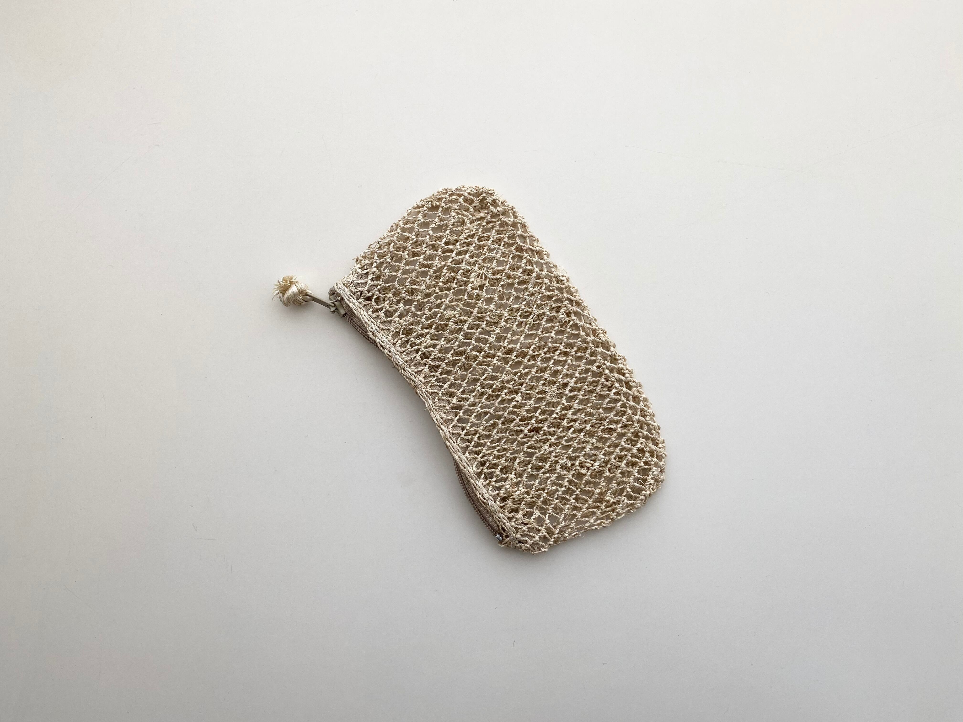 葛の茎の部分から取り出した繊維をつなげた糸をつかって、ラオス北部の村でひとつひとつ手編みで作られているポーチ。