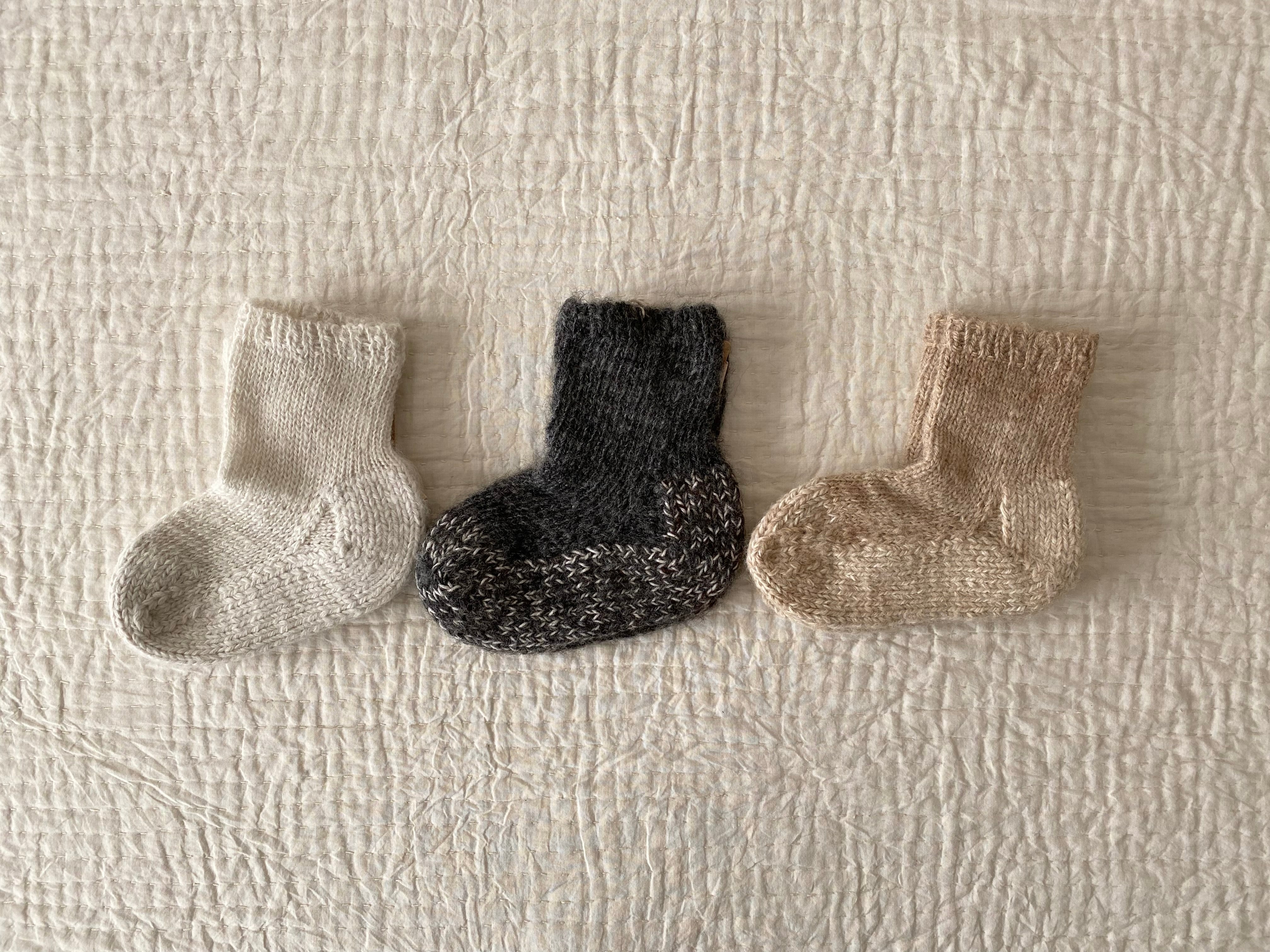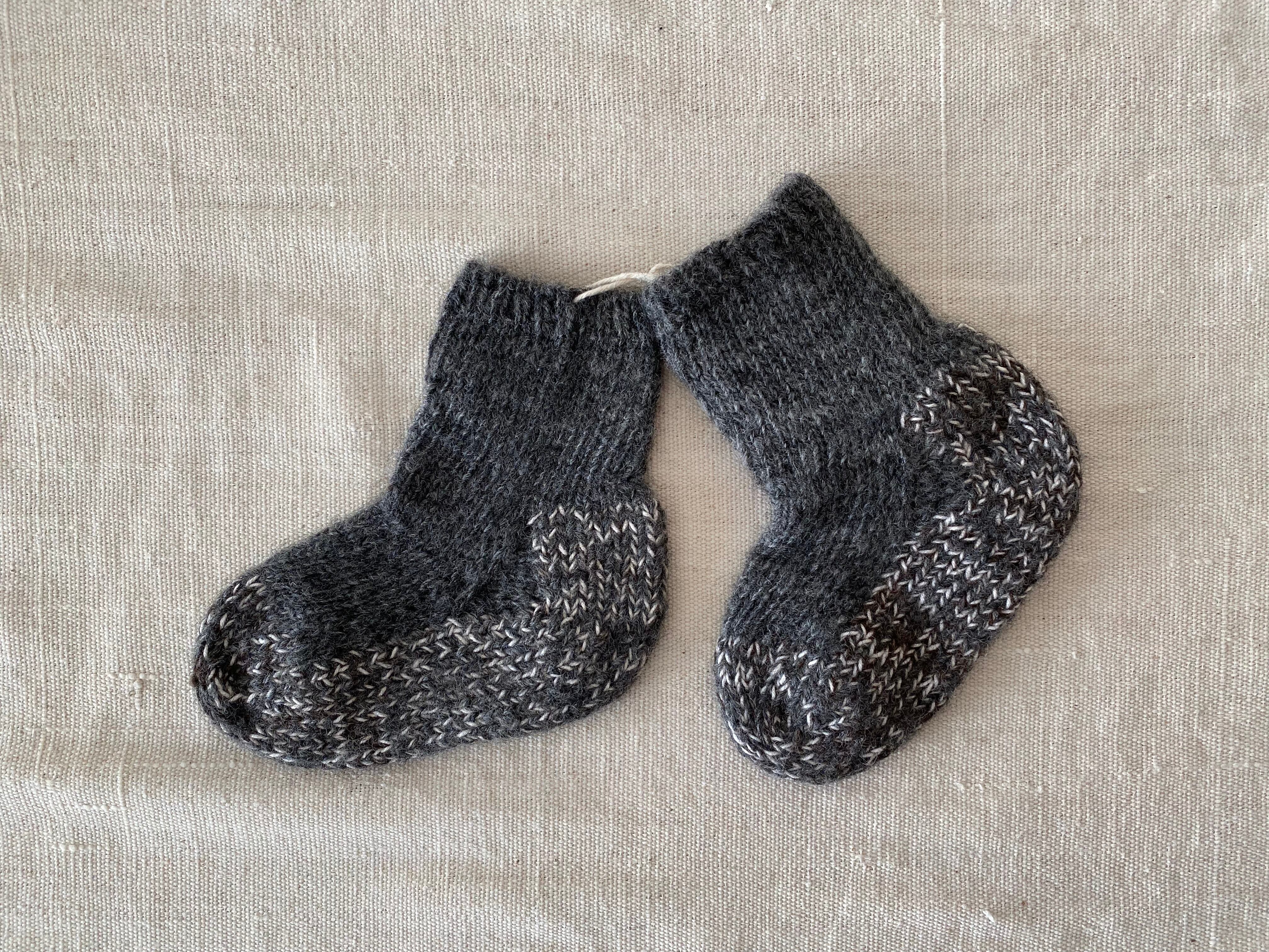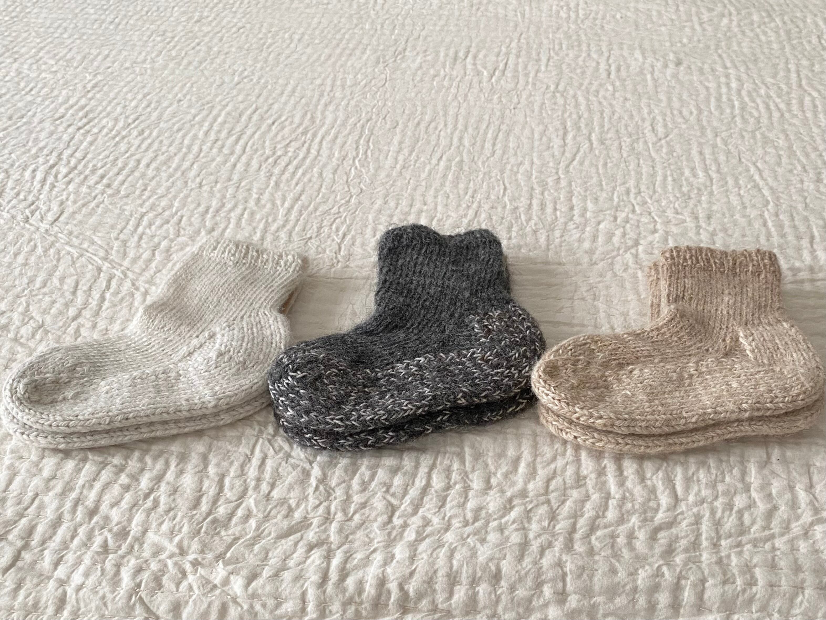 ペルー、プーノの村で、手紡ぎのアルパカを使って手編みされた靴下です。