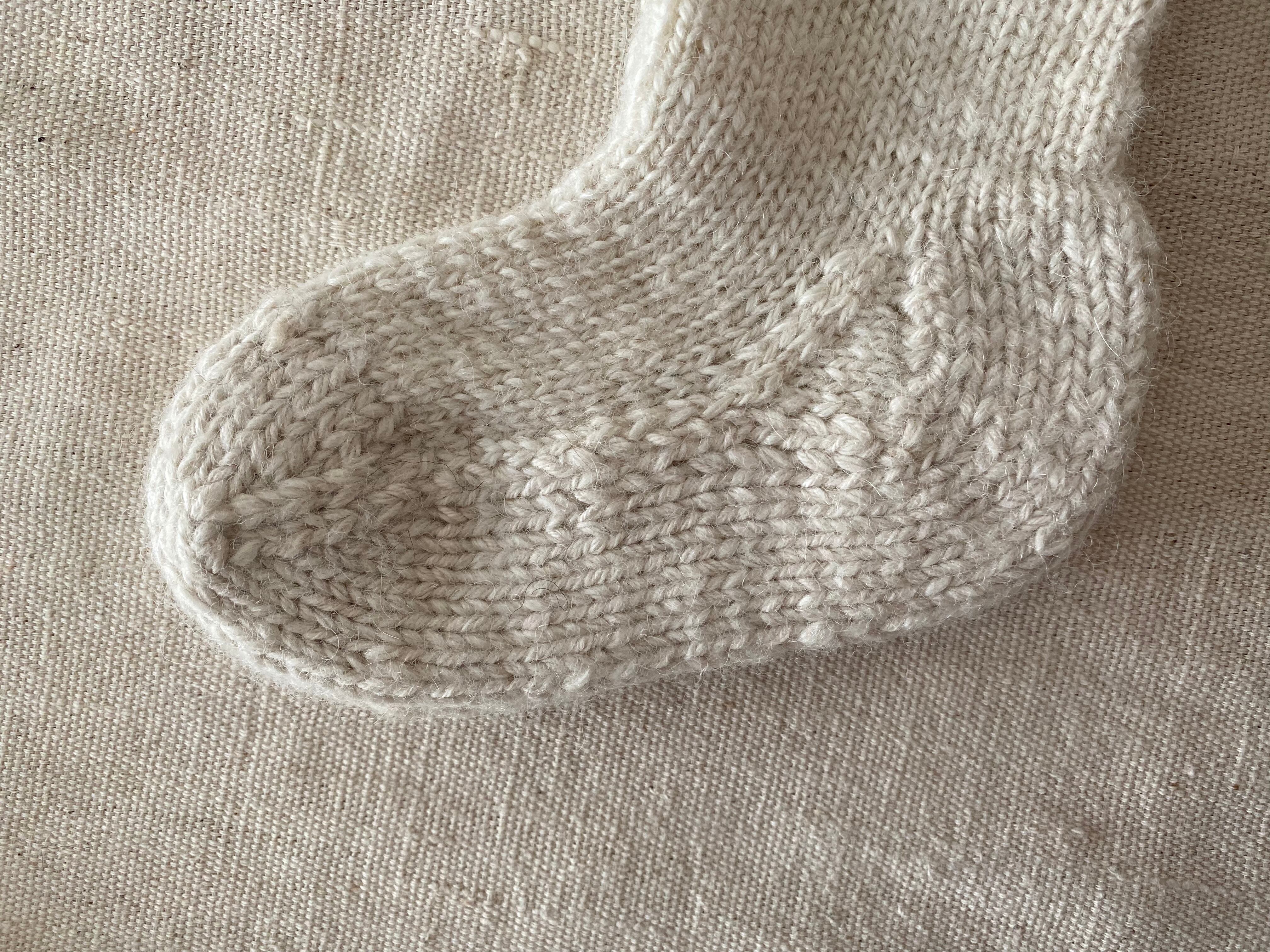 かかとからつま先までの足裏側と、つま先まわりはより丈夫にするため、アルパカ毛糸2本とコットン1本の3本で編んであります。