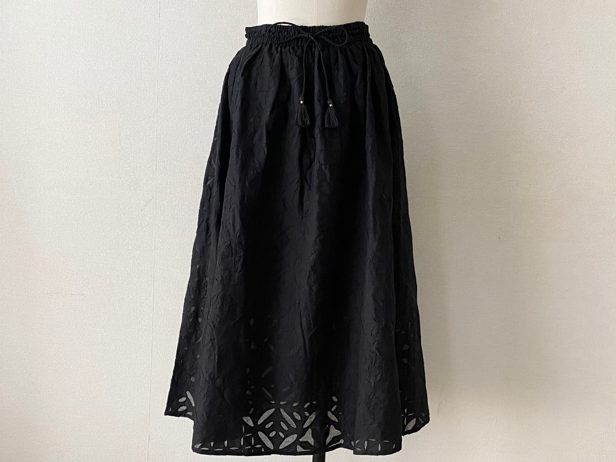 総丈90cm、ウエスト70~90cm(ウエストゴム+タッセル付きの紐)