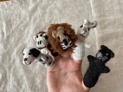 黒猫、ウサギ、ライオン、犬、サルの指人形のセット。