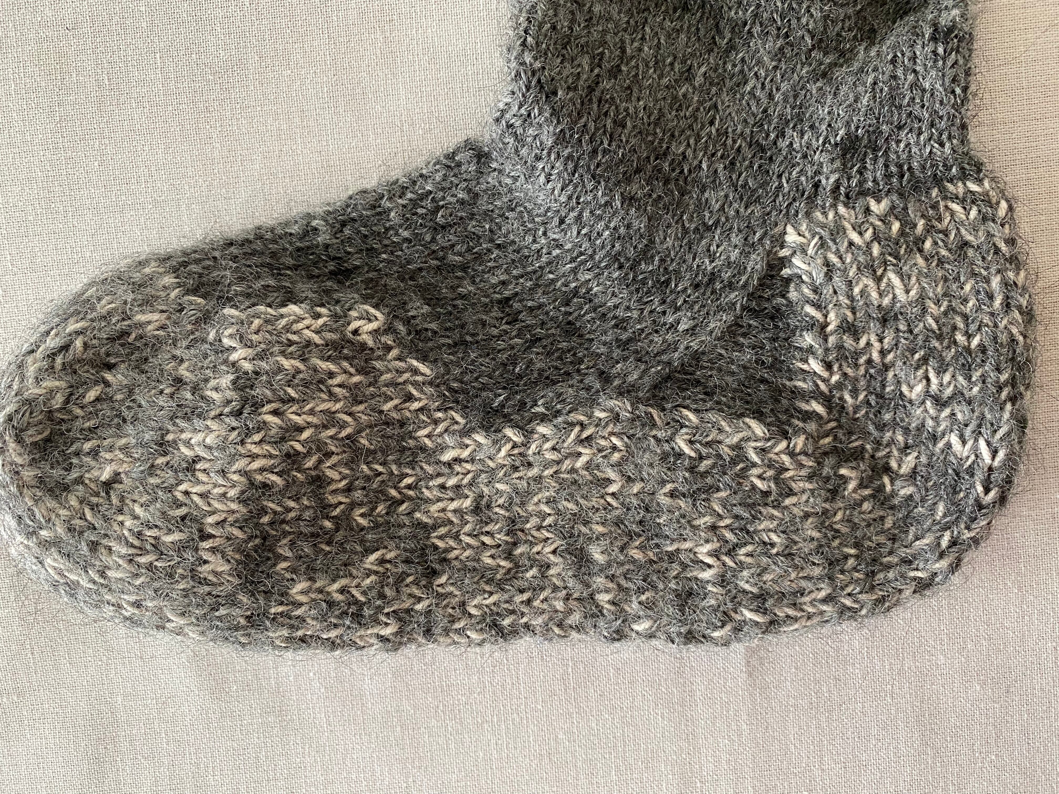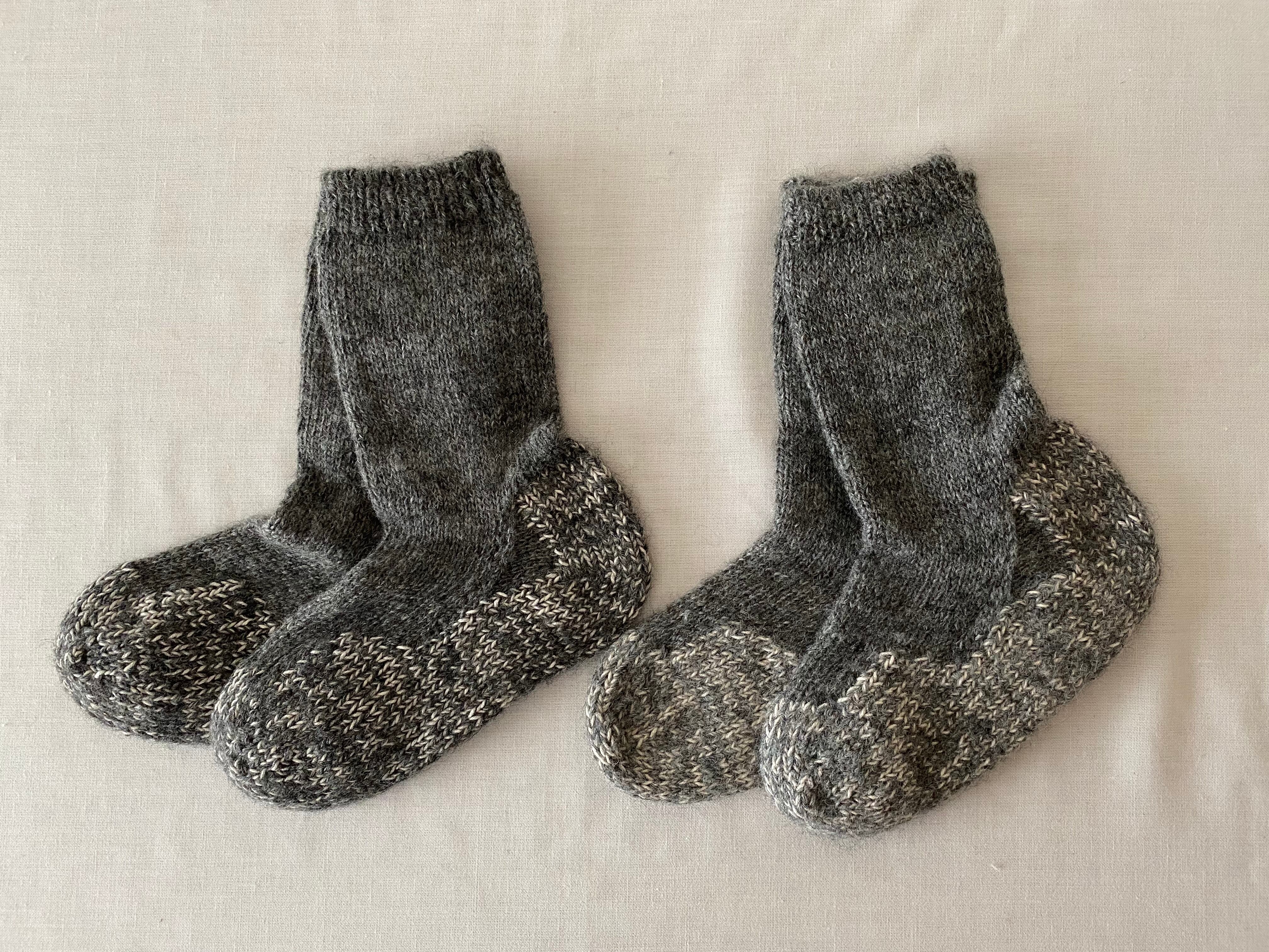 かかとからつま先まわりまではコットン1本、アルパカ毛糸2本の合計3本で編み足裏の強度を増しています。