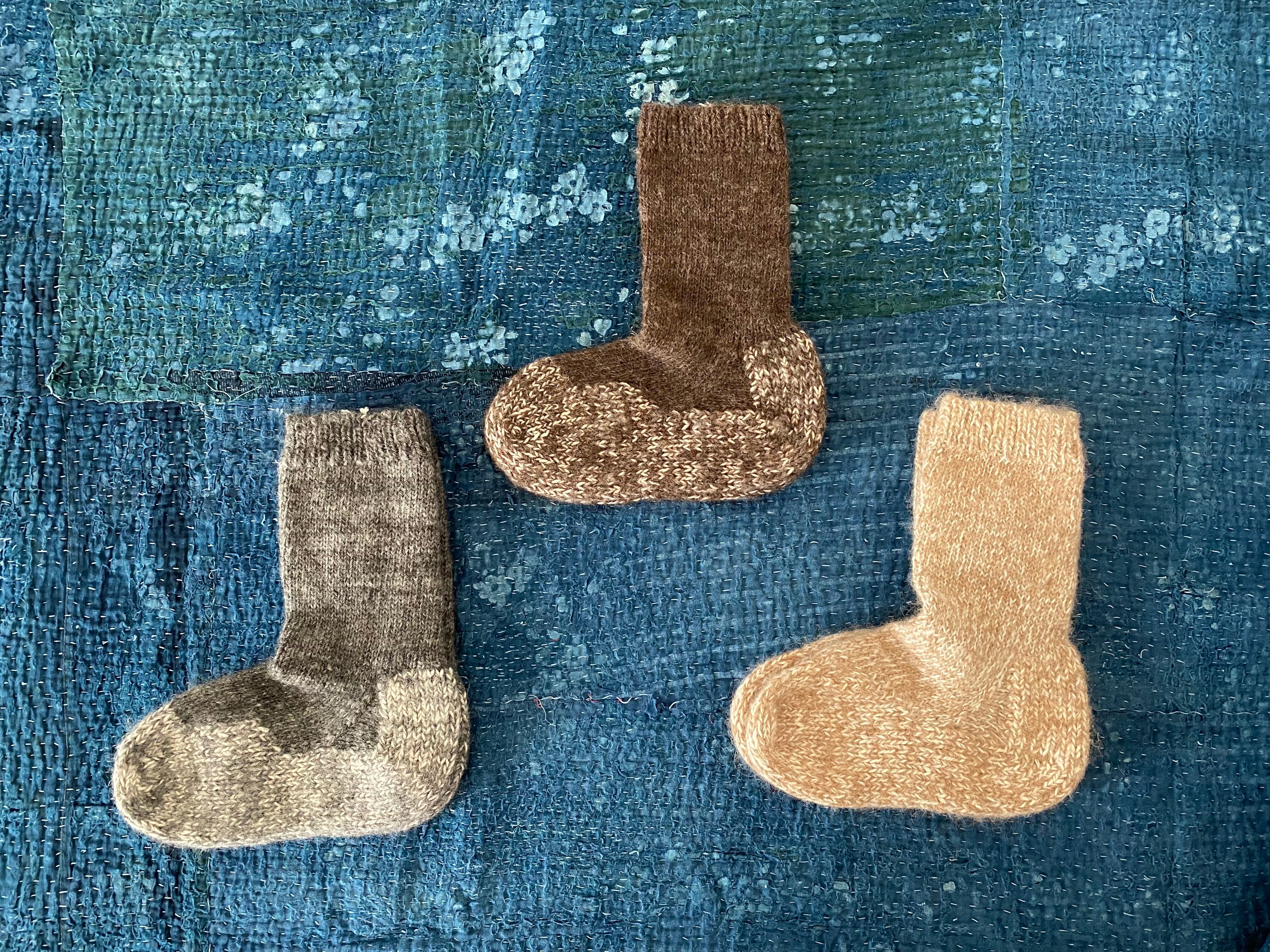 ペルー、プーノの村で、手紡ぎのアルパカ素材を使用して手編みされた靴下です。