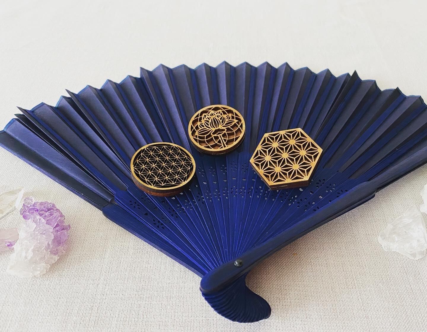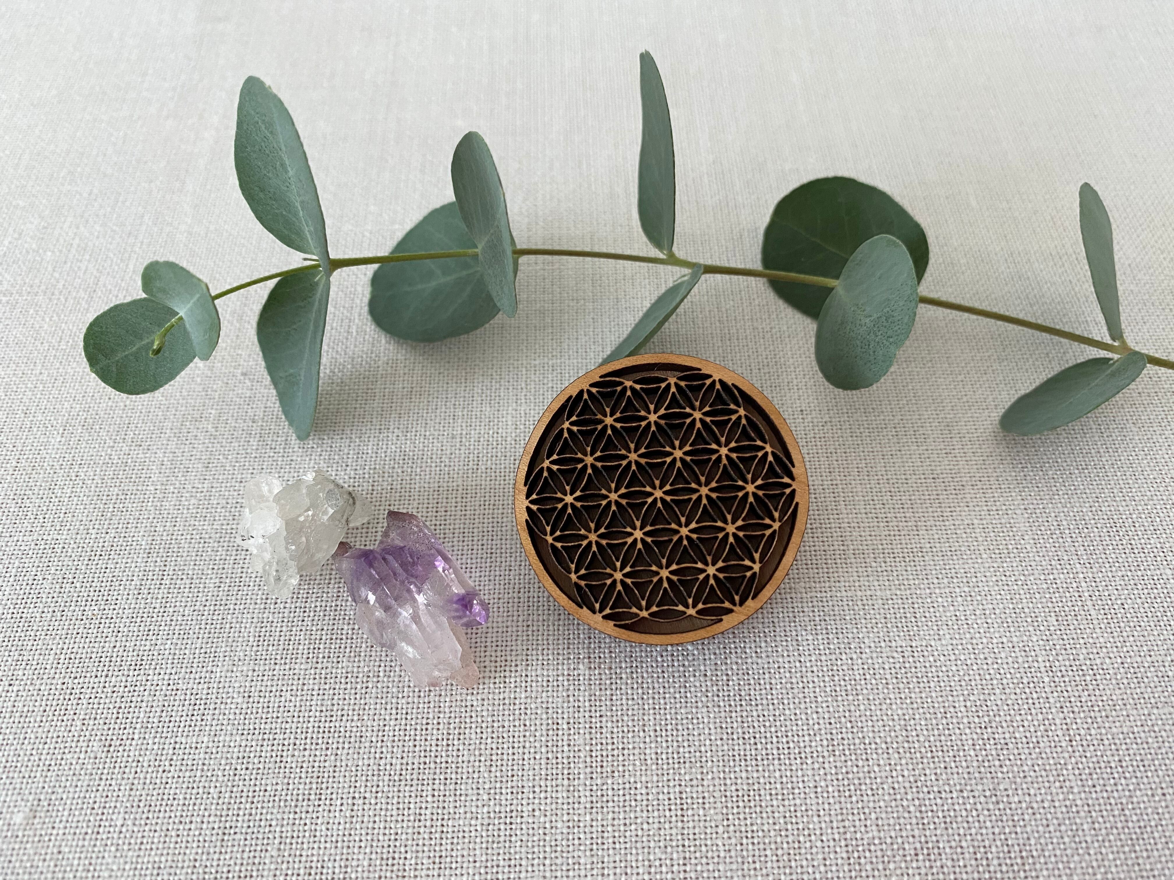 フラワーオブライフの木製の帯留めです。