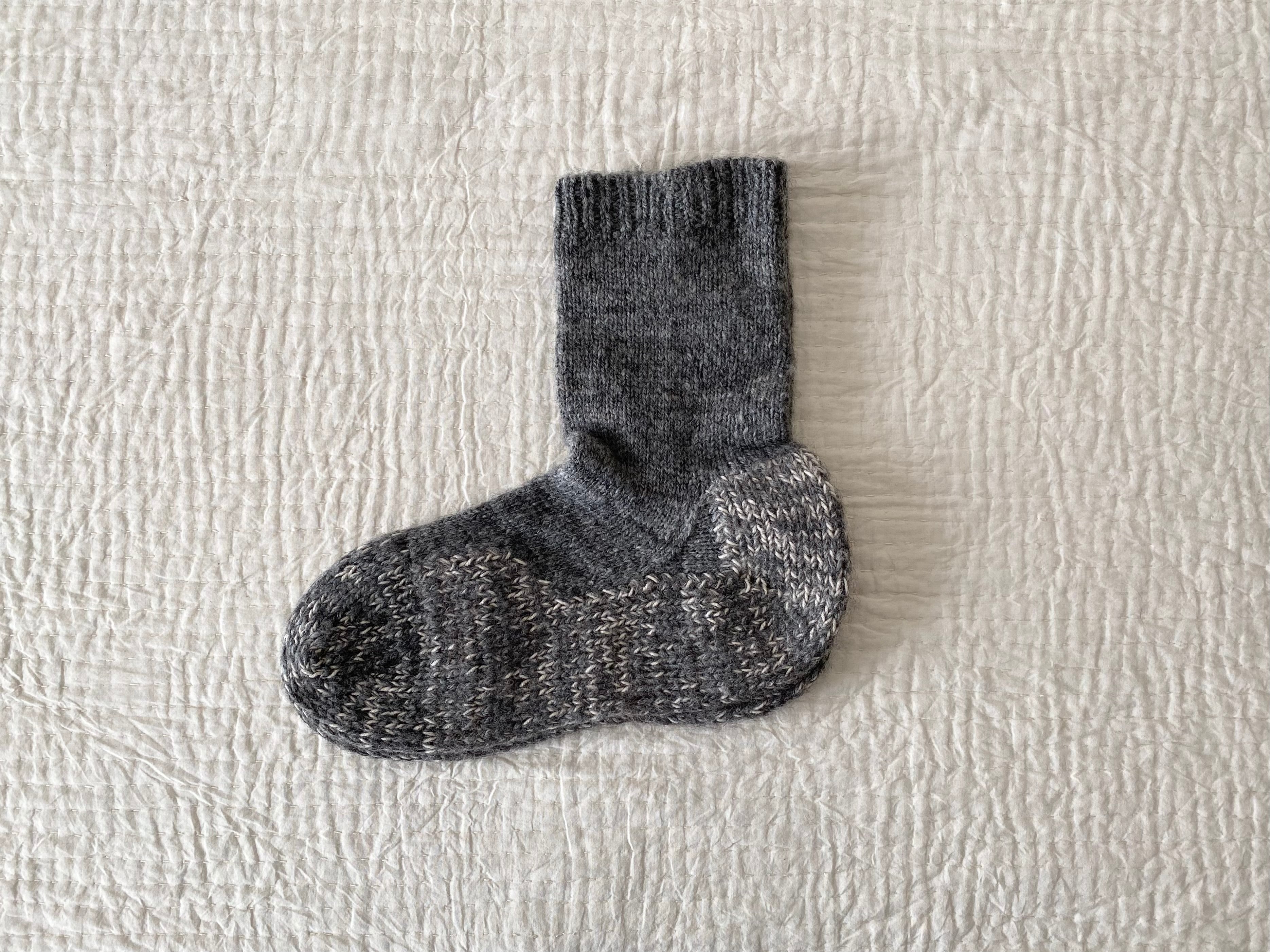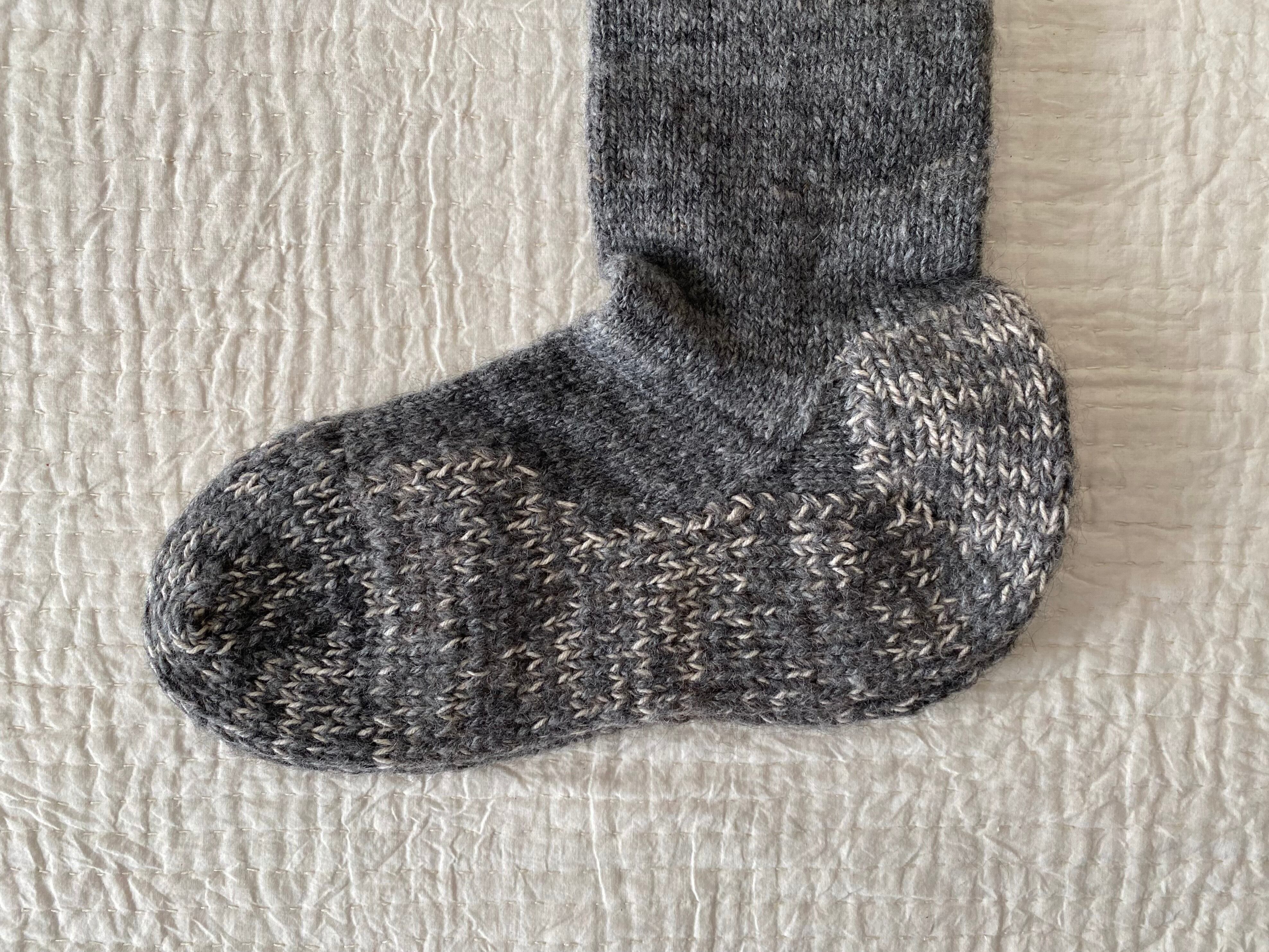 かかとからつま先まわりまではコットン1本、アルパカ毛糸2本の合計3本で編み足裏の強度を増しています。