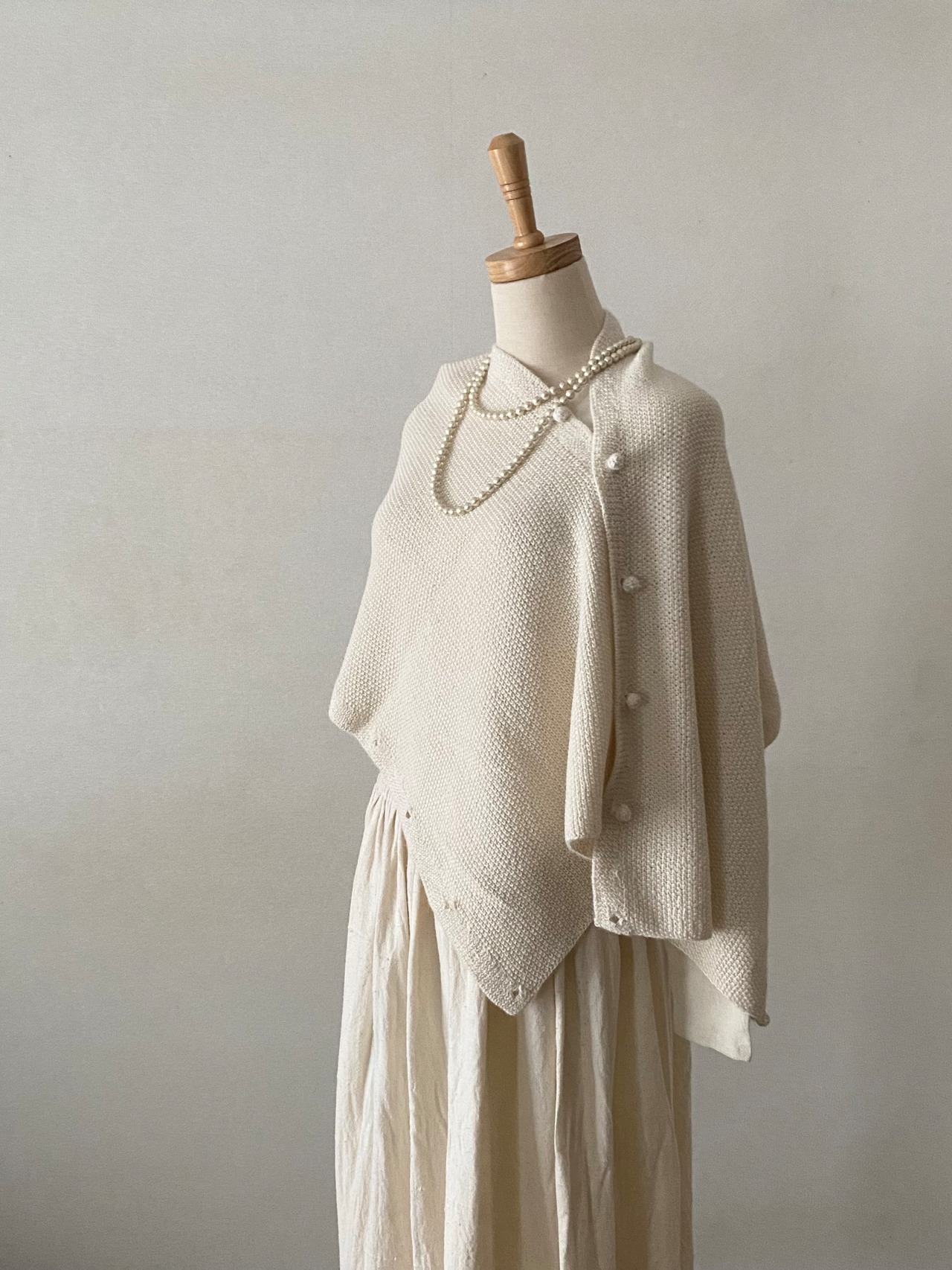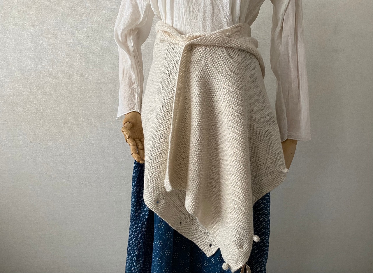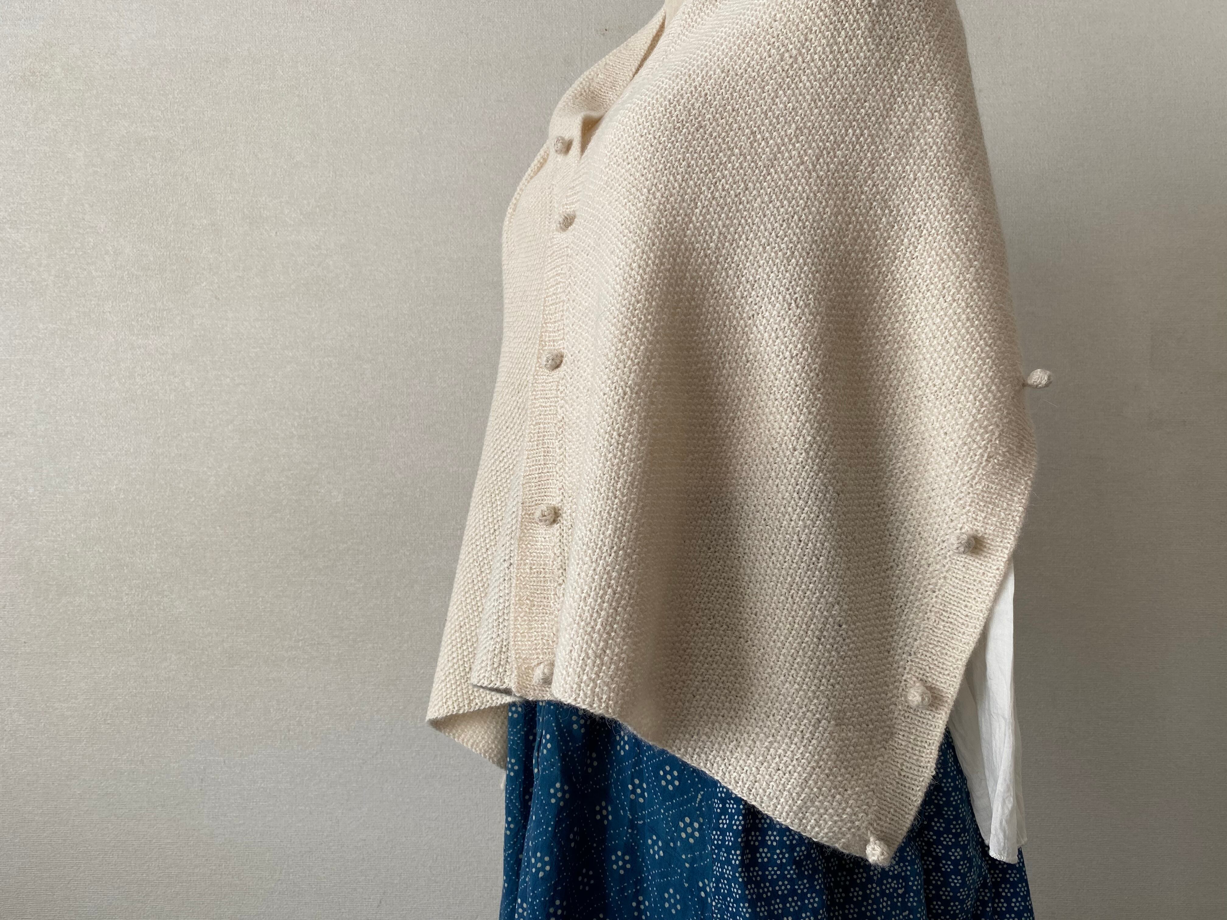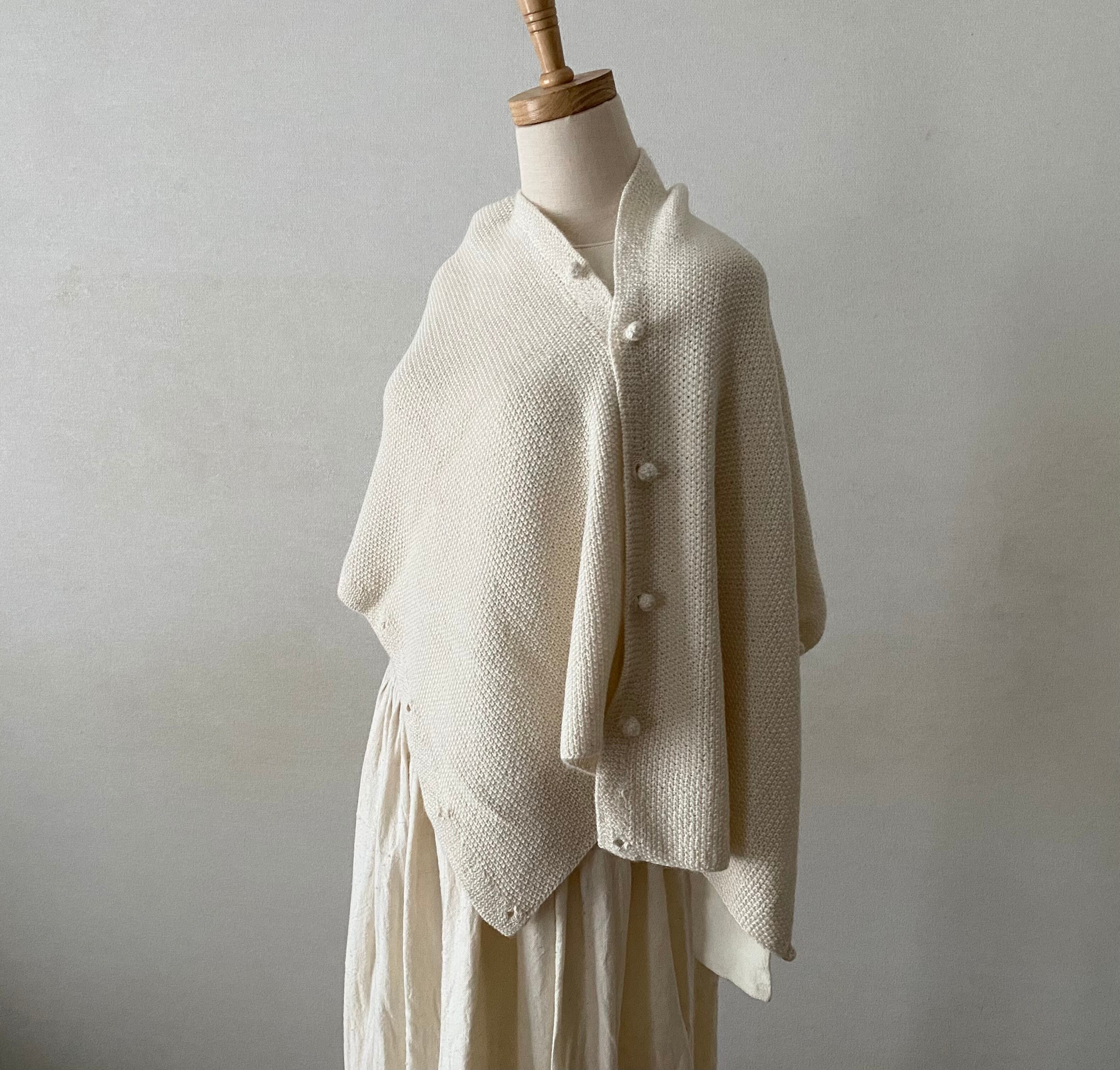 長方形のかたちのショールに、丸みを帯びたくるみボタンが10個ついています。