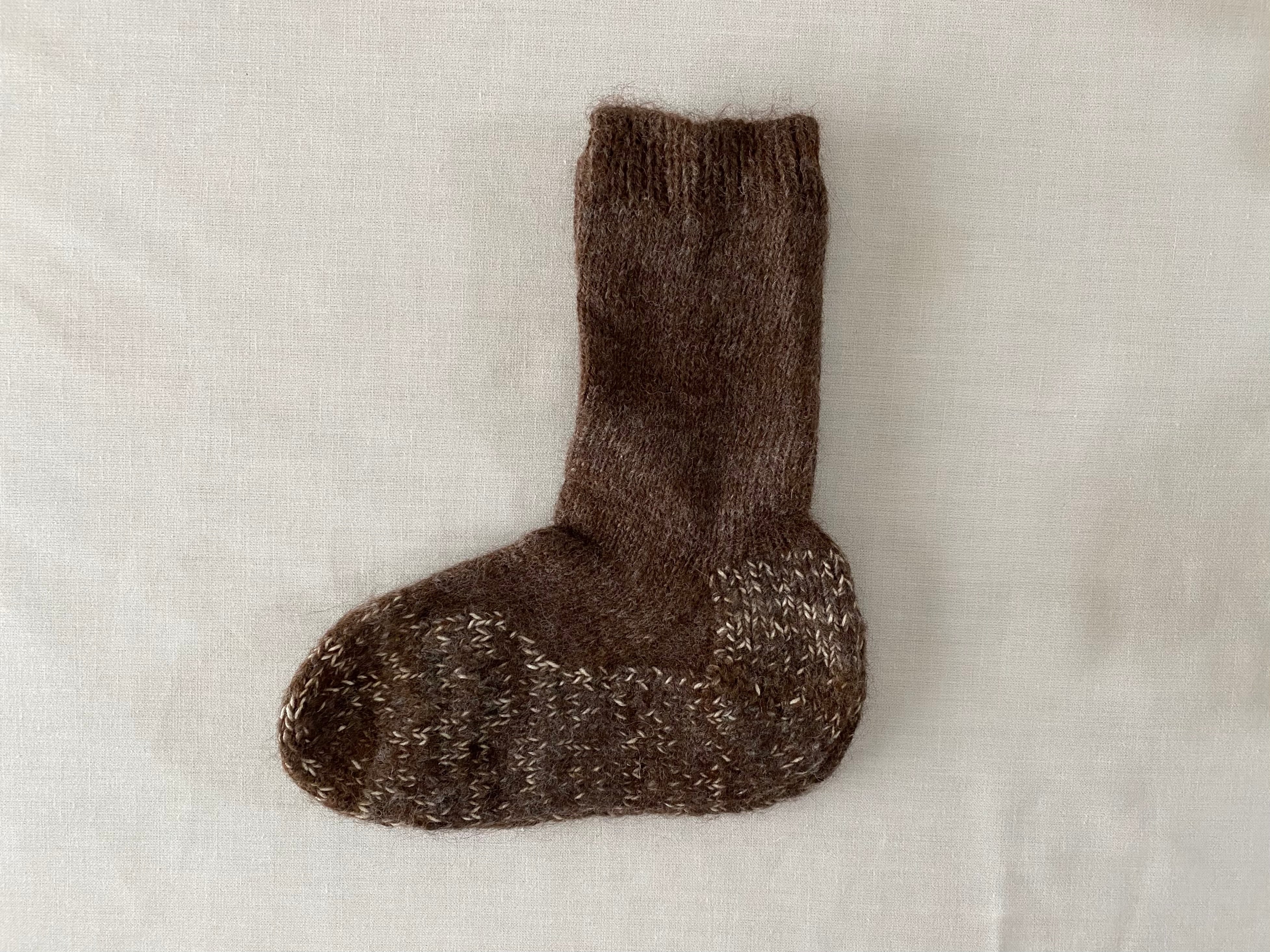 ペルー、プーノの村で、アルパカの原毛を手紡ぎして手編みした靴下です。