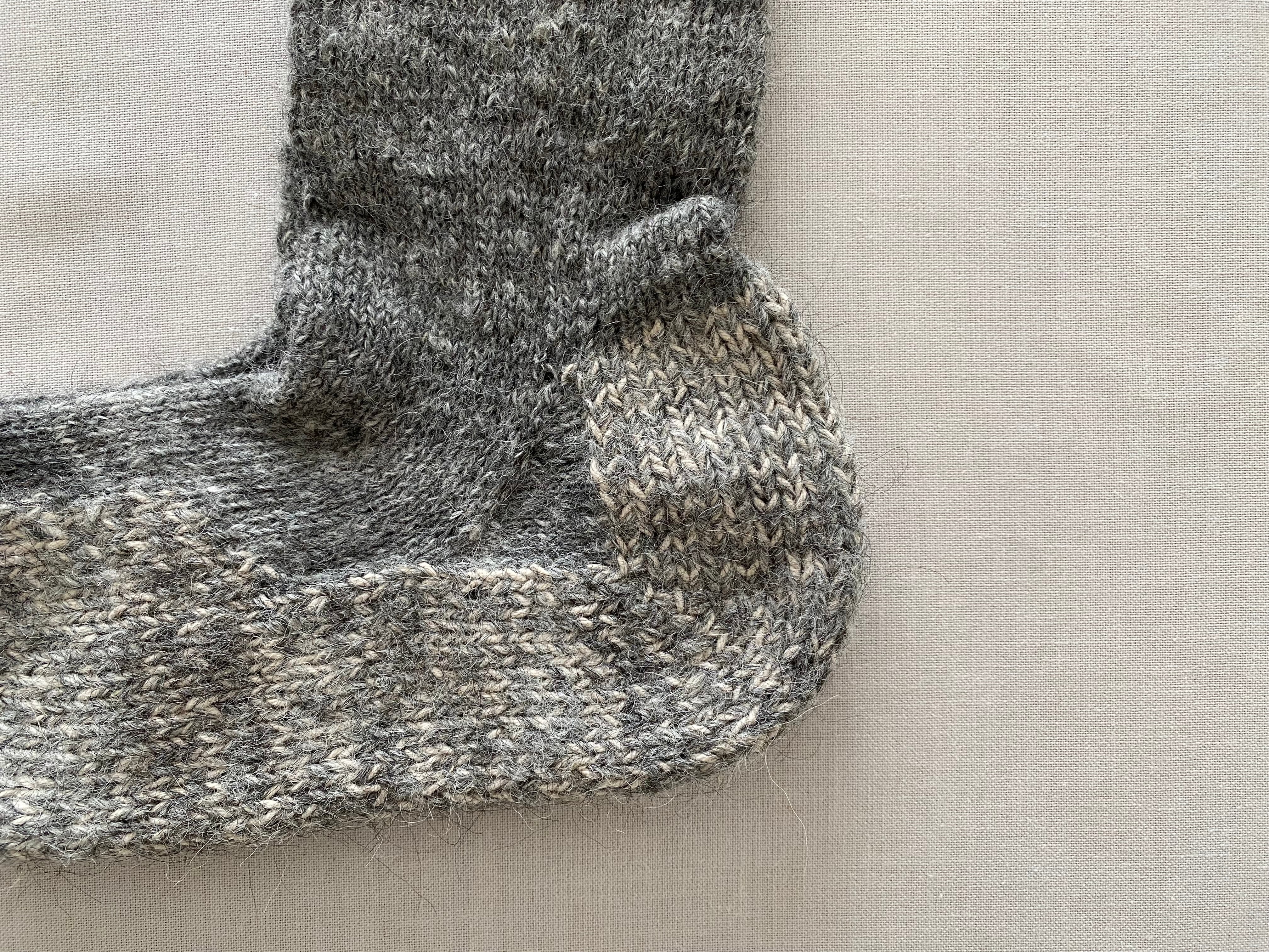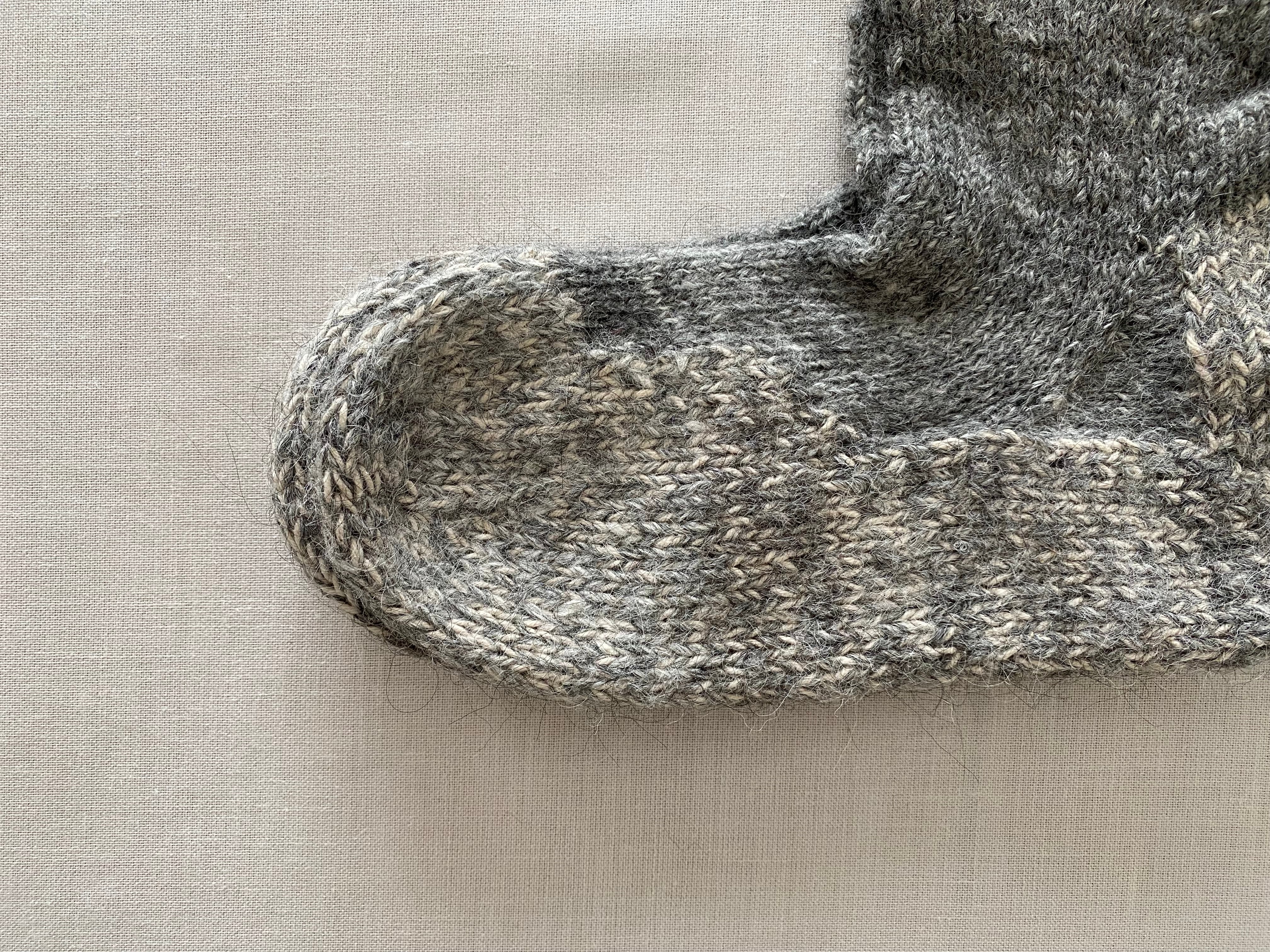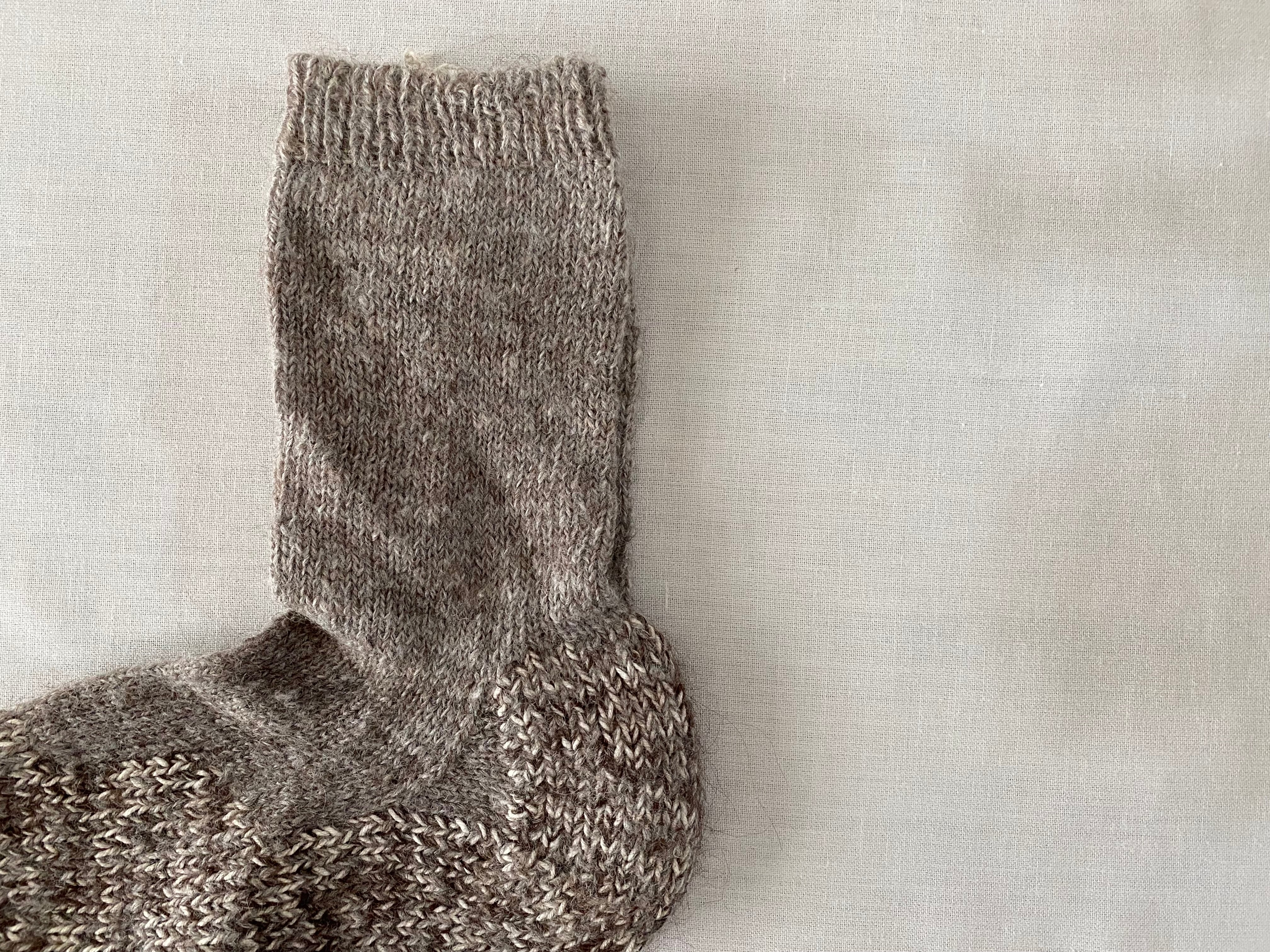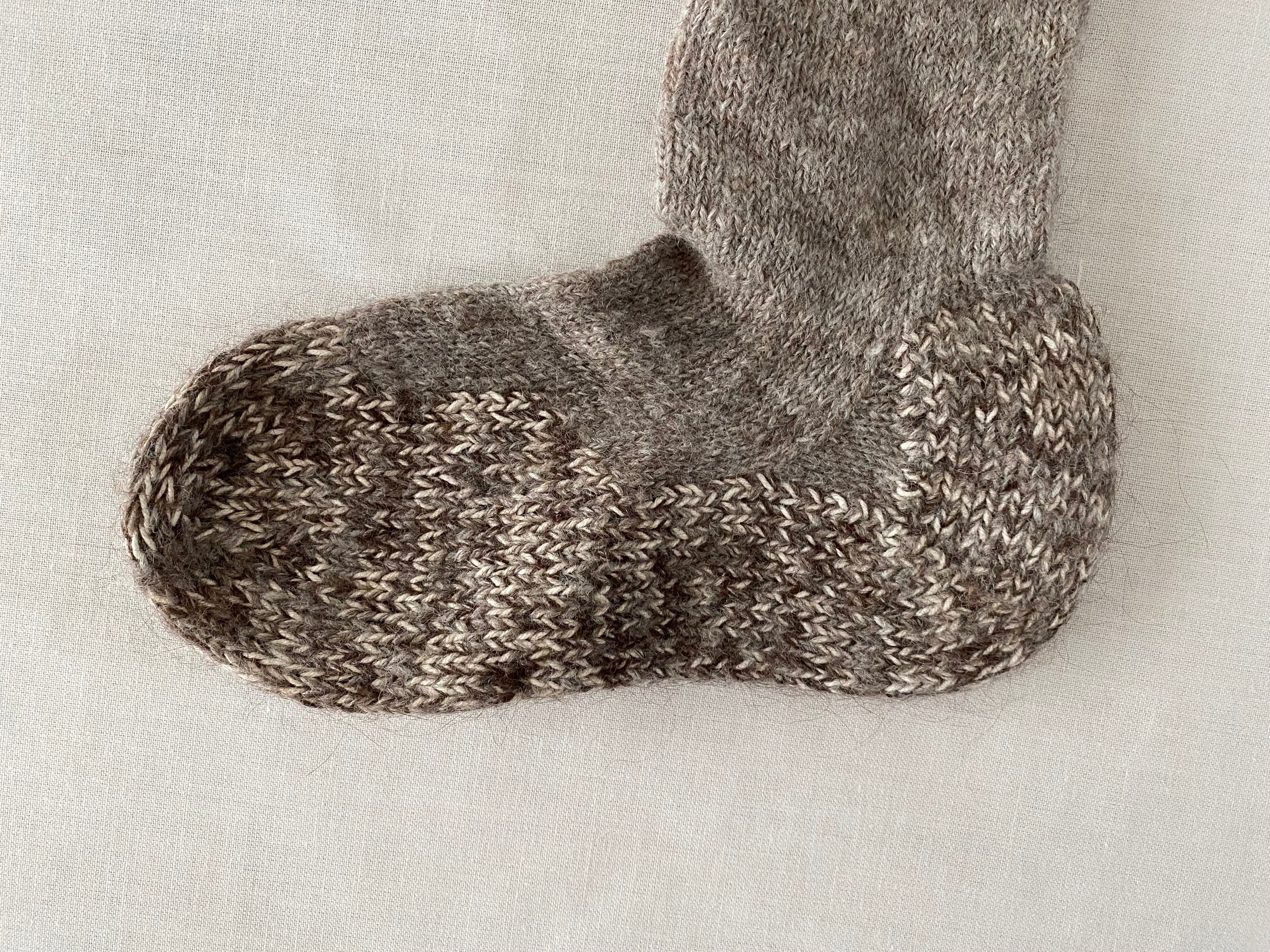 ペルー、プーノの村で、アルパカの原毛を手紡ぎして手編みした靴下です。