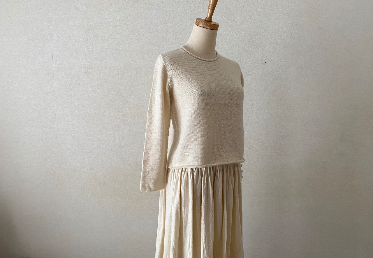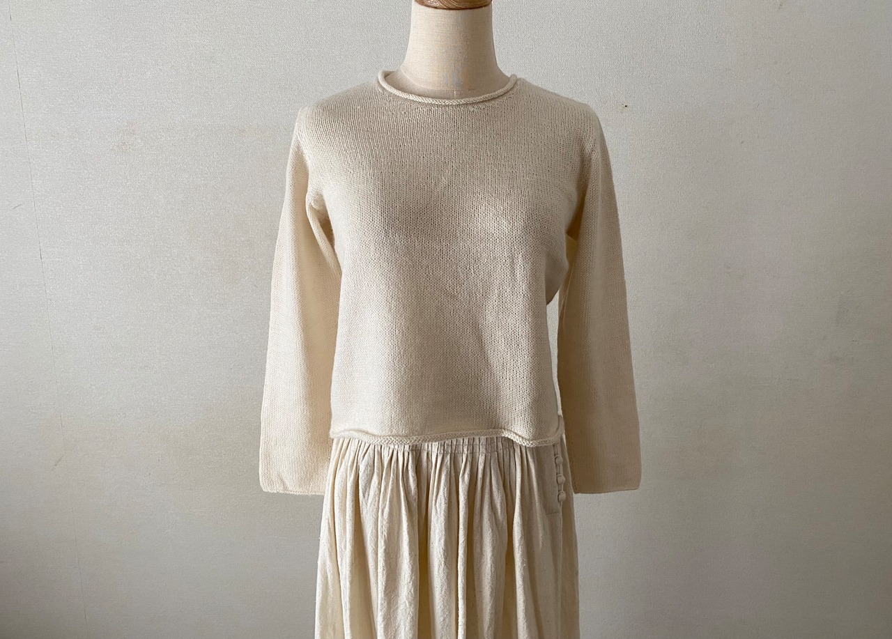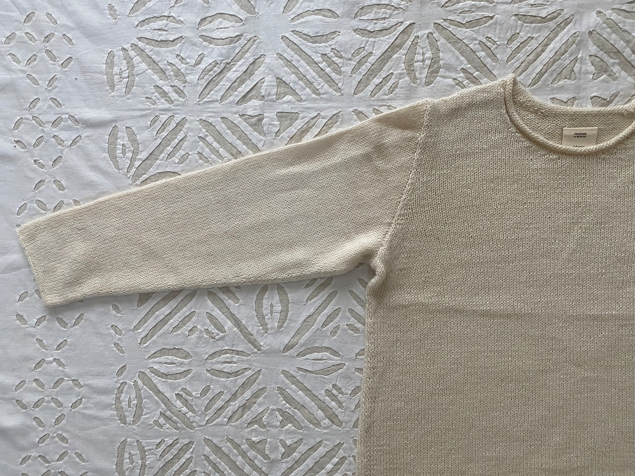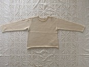 首まわりと袖まわりが外側にくるまるシンプルなセーターです。