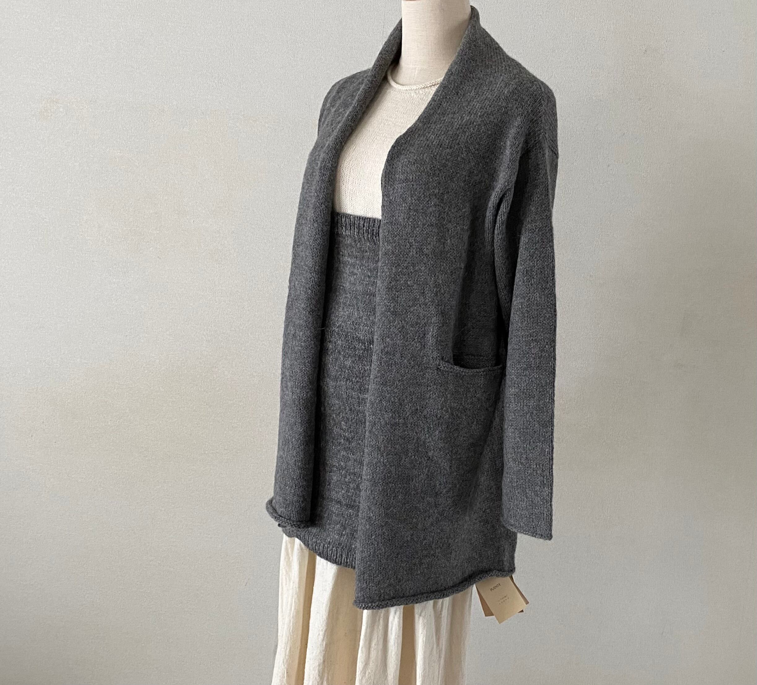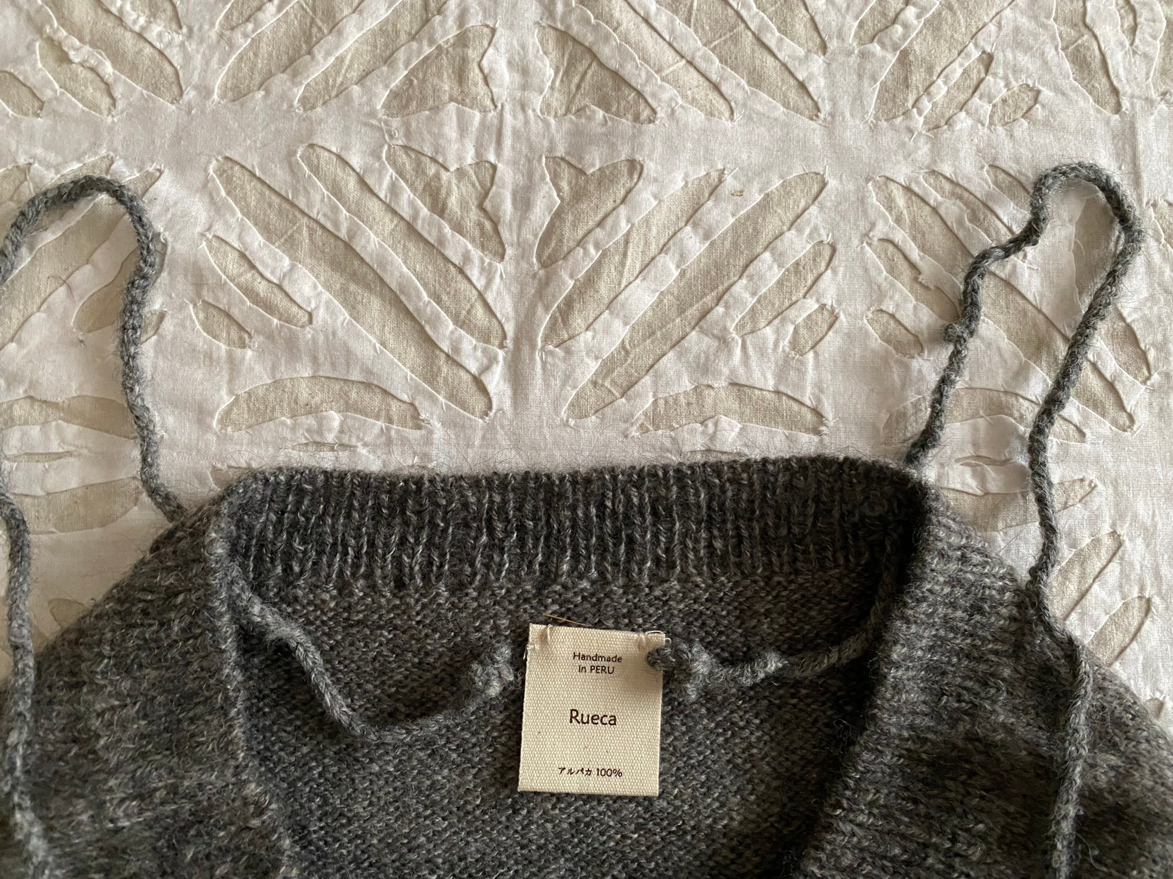 手紡ぎコマで手紡ぎしたアルパカの毛糸を手編みして作られています。
