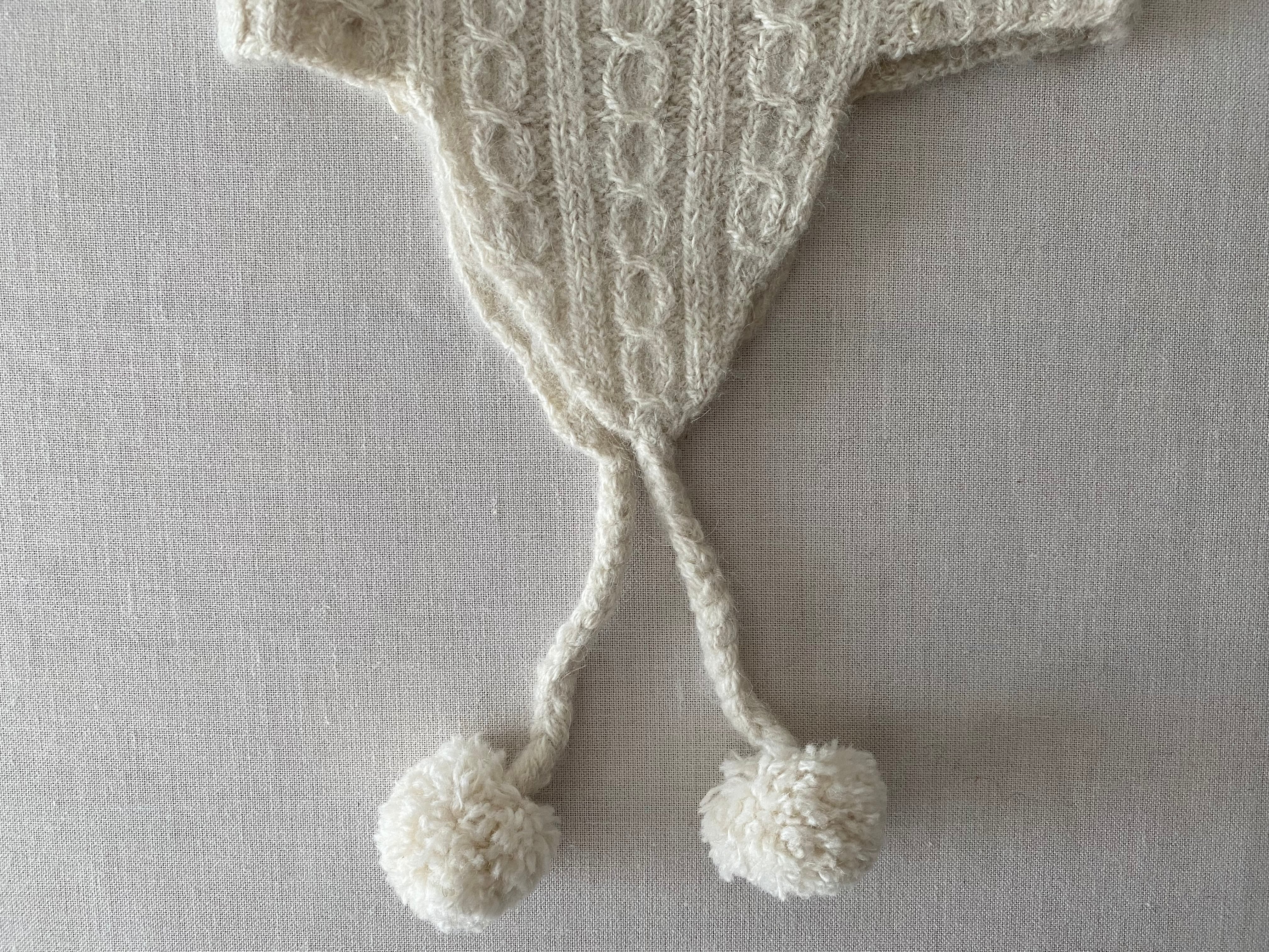 アルパカの元もを手紡ぎして手編みした、大人用の耳あて付きニットキャップです。