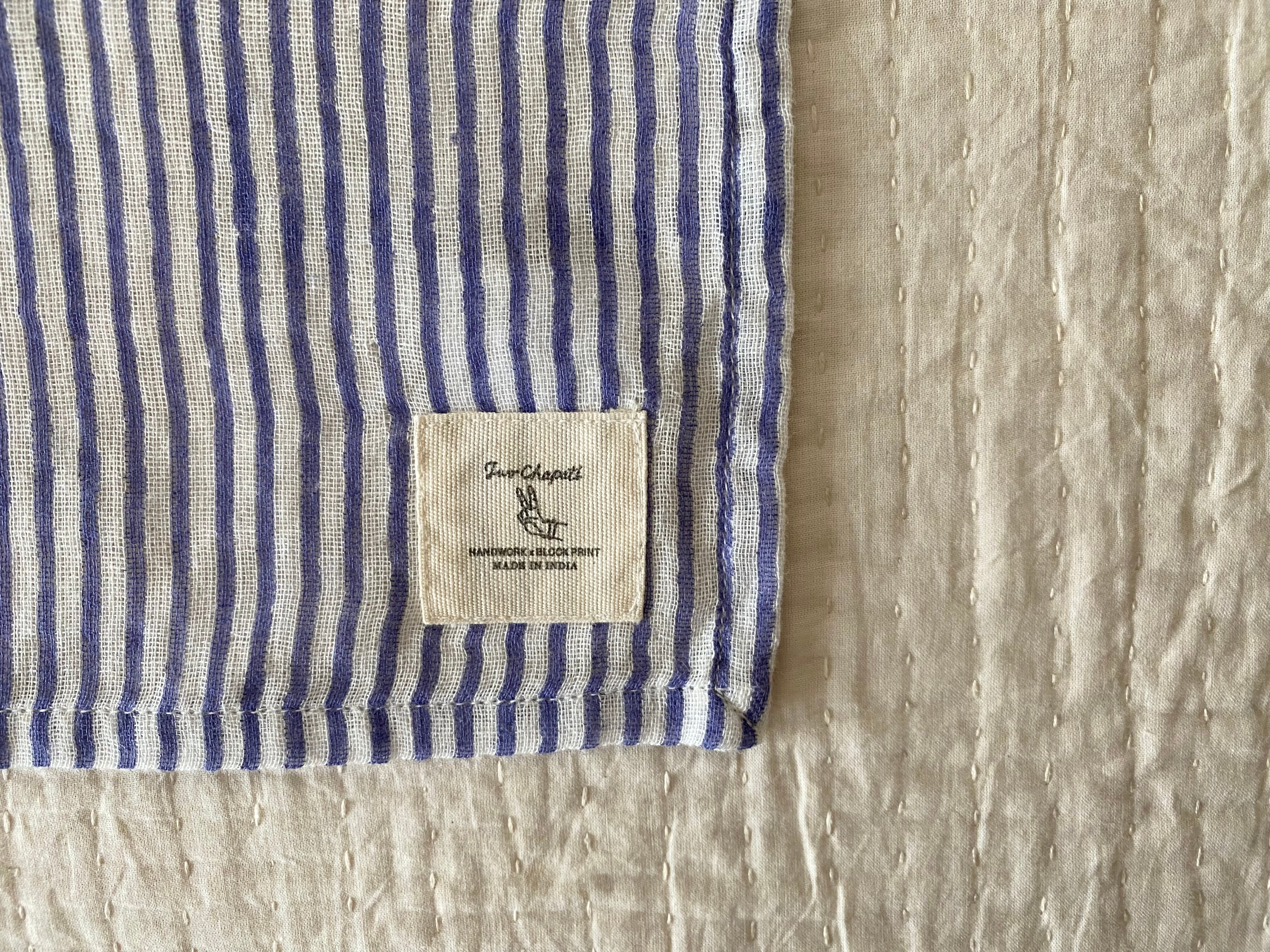 色のにじみやムラ、版のズレ、インク飛び、糸始末、織りキズはインドの手仕事の風合いとしてお楽しみください。