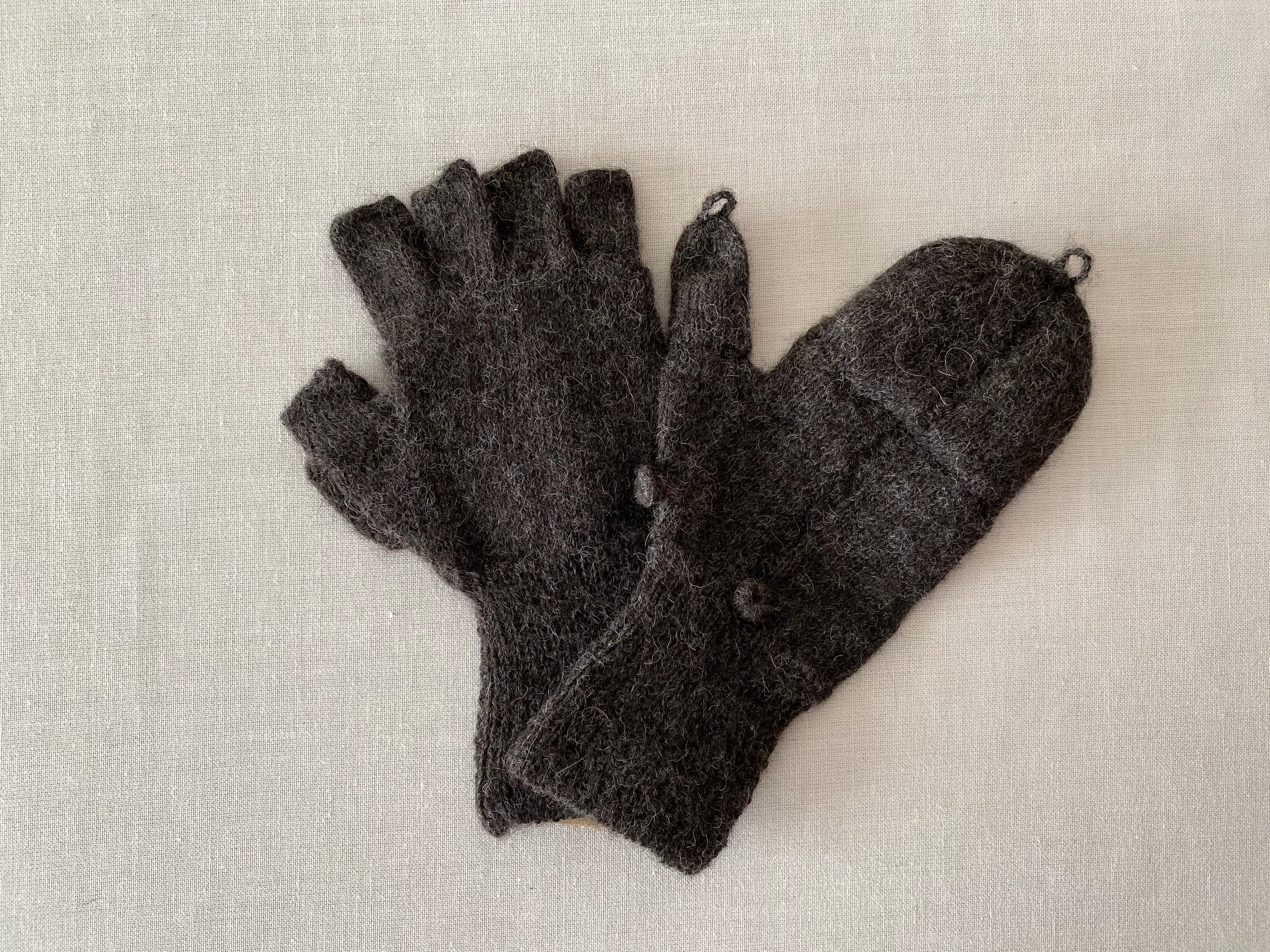 指先部分にも親指にもふたがついている、アルパカ素材のミトンの手袋です。