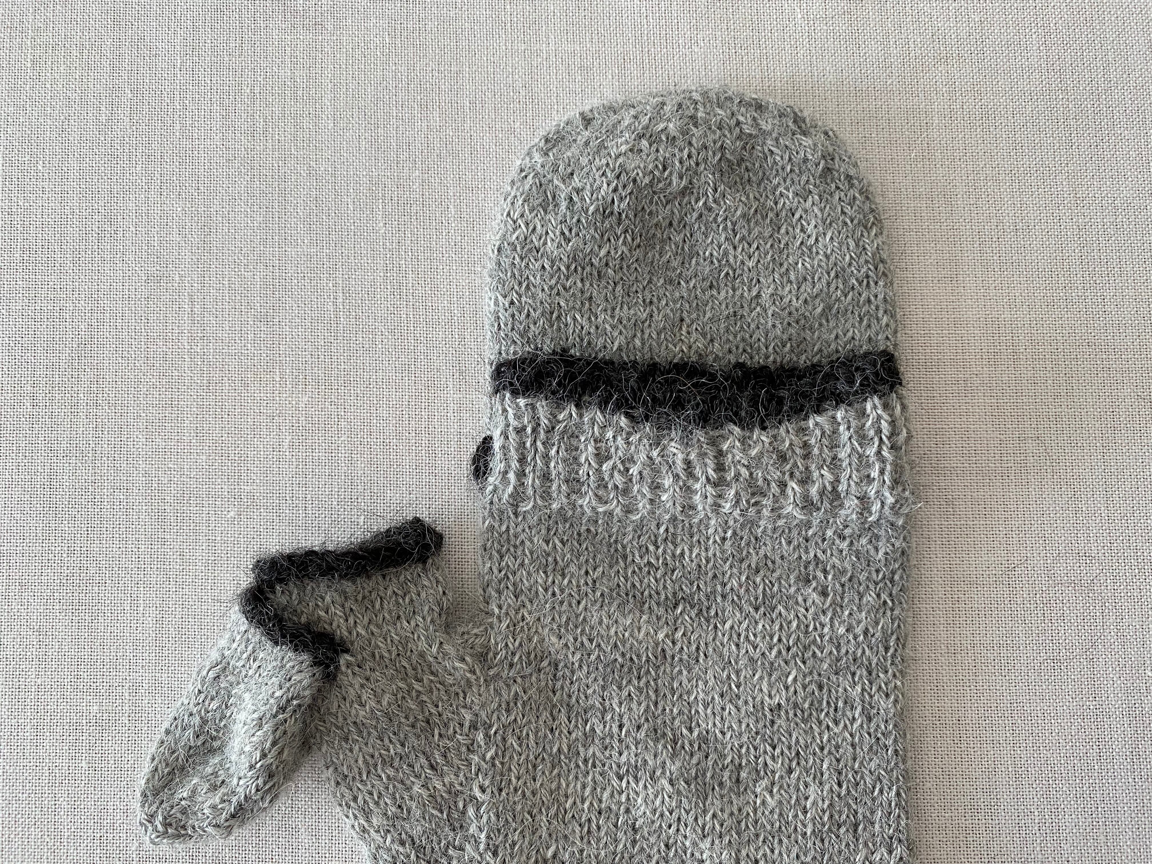 指先部分にふたがあり、親指にもふたがついているアルパカ素材のミトンの手袋です。