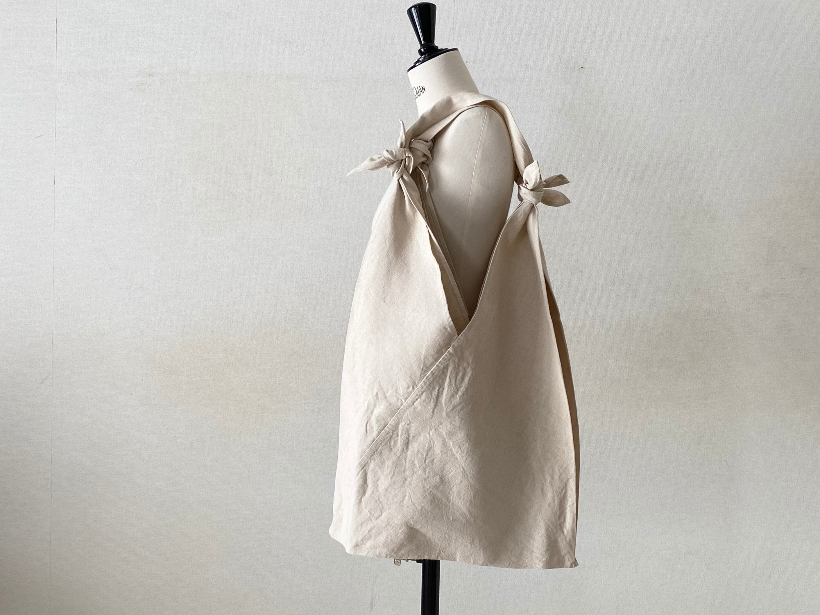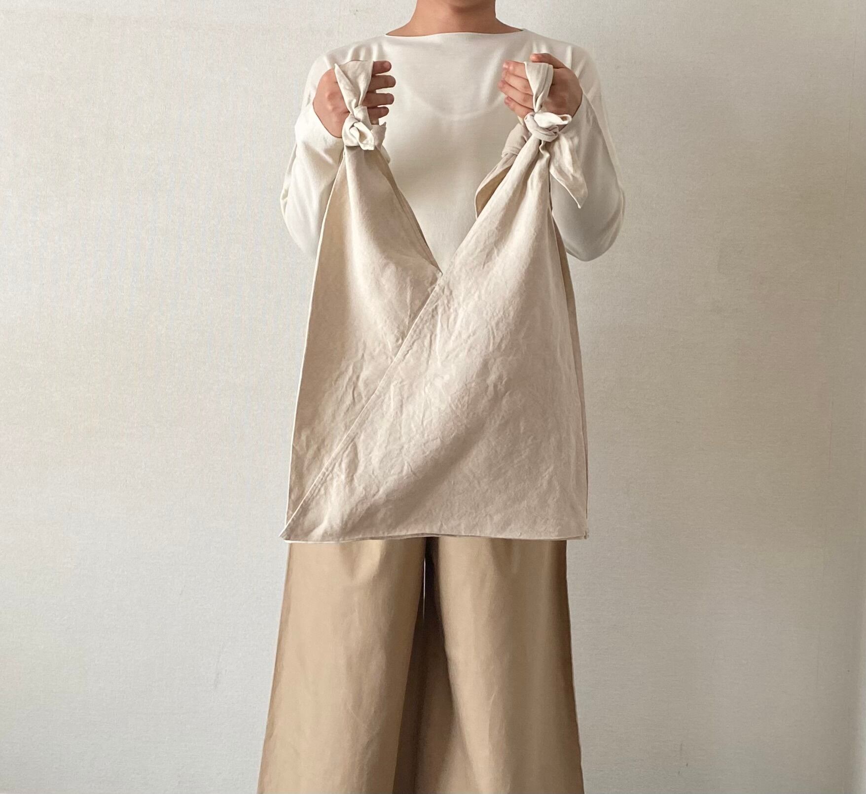 あずま袋が2つ繋がった特徴的なデザインで、一つを裏返すことでバッグが二重に重なり、内側と外側でセパレートして使うことができます。